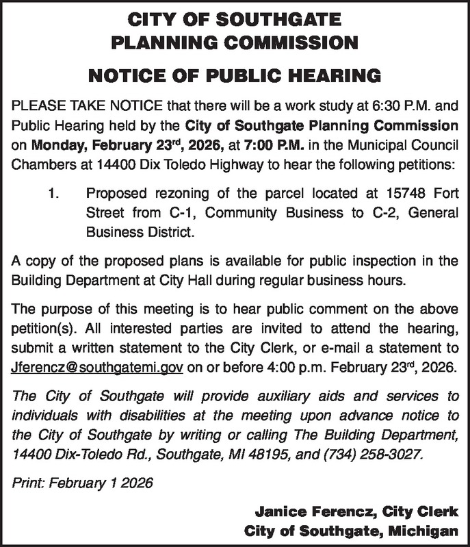 CITY OF SOUTHGATE PLANNING COMMISSION NOTICE OF PUBLIC HEARING PLEASE TAKE NOTICE that there will be a work study at 6:30 P.M. and Public Hearing held by the City of Southgate Planning Commission on Monday, February 23rd, 2026, at 7:00 P.M. in the Municipal Council Chambers at 14400 Dix Toledo Highway to hear the following petitions: 1. Proposed rezoning of the parcel located at 15748 Fort Street from C-1, Community Business to C-2, General Business District. A copy of the proposed plans is available for public inspection in the Building Department at City Hall during regular business hours. The purpose of this meeting is to hear public comment on the above petition(s). All interested parties are invited to attend the hearing, submit a written statement to the City Clerk, or e-mail a statement to Jferencz@southgatemi.gov on or before 4:00 p.m. February 23rd, 2026. The City of Southgate will provide auxiliary aids and services to individuals with disabilities at the meeting upon advance notice to the City of Southgate by writing or calling The Building Department, 14400 Dix-Toledo Rd., Southgate, MI 48195, and (734) 258-3027. Print: February 1 2026 Janice Ferencz, City Clerk City of Southgate, Michigan