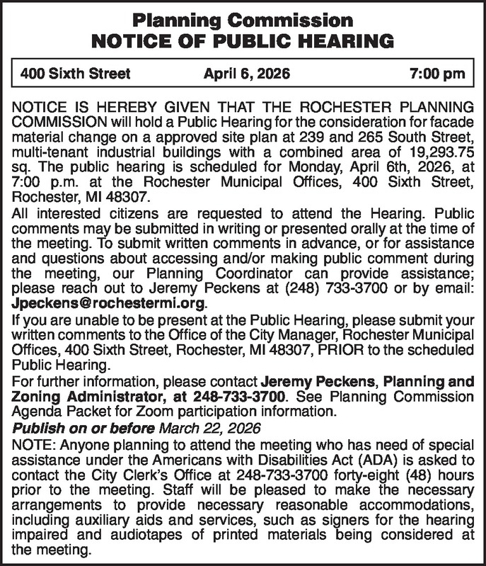 Planning Commission NOTICE OF PUBLIC HEARING 400 Sixth Street April 6, 2026 7:00 pm NOTICE IS HEREBY GIVEN THAT THE ROCHESTER PLANNING COMMISSION will hold a Public Hearing for the consideration for facade material change on a approved site plan at 239 and 265 South Street, multi-tenant industrial buildings with a combined area of 19,293.75 sq. The public hearing is scheduled for Monday, April 6th, 2026, at 7:00 p.m. at the Rochester Municipal Offices, 400 Sixth Street, Rochester, MI 48307. All interested citizens are requested to attend the Hearing. Public comments may be submitted in writing or presented orally at the time of the meeting. To submit written comments in advance, or for assistance and questions about accessing and/or making public comment during the meeting, our Planning Coordinator can provide assistance; please reach out to Jeremy Peckens at (248) 733-3700 or by email: Jpeckens@rochestermi.org. If you are unable to be present at the Public Hearing, please submit your written comments to the Office of the City Manager, Rochester Municipal Offices, 400 Sixth Street, Rochester, MI 48307, PRIOR to the scheduled Public Hearing. For further information, please contact Jeremy Peckens, Planning and Zoning Administrator, at 248-733-3700. See Planning Commission Agenda Packet for Zoom participation information. Publish on or before March 22, 2026 NOTE: Anyone planning to attend the meeting who has need of special assistance under the Americans with Disabilities Act (ADA) is asked to contact the City Clerk’s Office at 248-733-3700 forty-eight (48) hours prior to the meeting. Staff will be pleased to make the necessary arrangements to provide necessary reasonable accommodations, including auxiliary aids and services, such as signers for the hearing impaired and audiotapes of printed materials being considered at the meeting