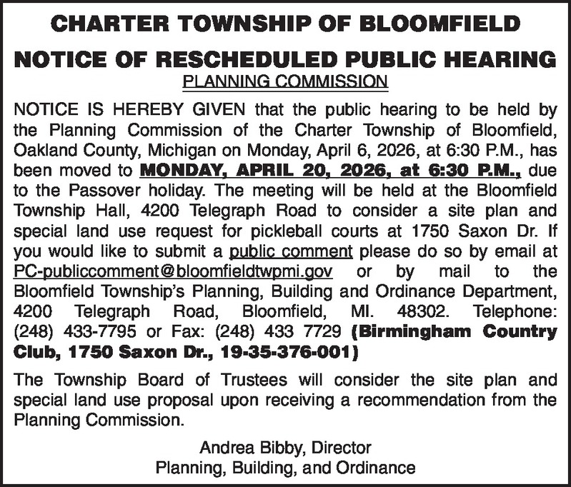 CHARTER TOWNSHIP OF BLOOMFIELD NOTICE OF RESCHEDULED PUBLIC HEARING PLANNING COMMISSION NOTICE IS HEREBY GIVEN that the public hearing to be held by the Planning Commission of the Charter Township of Bloomfield, Oakland County, Michigan on Monday, April 6, 2026, at 6:30 P.M., has been moved to MONDAY, APRIL 20, 2026, at 6:30 P.M., due to the Passover holiday. The meeting will be held at the Bloomfield Township Hall, 4200 Telegraph Road to consider a site plan and special land use request for pickleball courts at 1750 Saxon Dr. If you would like to submit a public comment please do so by email at PC-publiccomment@bloomfieldtwpmi.gov or by mail to the Bloomfield Township’s Planning, Building and Ordinance Department, 4200 Telegraph Road, Bloomfield, MI. 48302. Telephone: (248) 433-7795 or Fax: (248) 433-7729. (Birmingham Country Club, 1750 Saxon Dr., 19-35-376-001) The Township Board of Trustees will consider the site plan and special land use proposal upon receiving a recommendation from the Planning Commission. Andrea Bibby, Director Planning, Building, and Ordinance