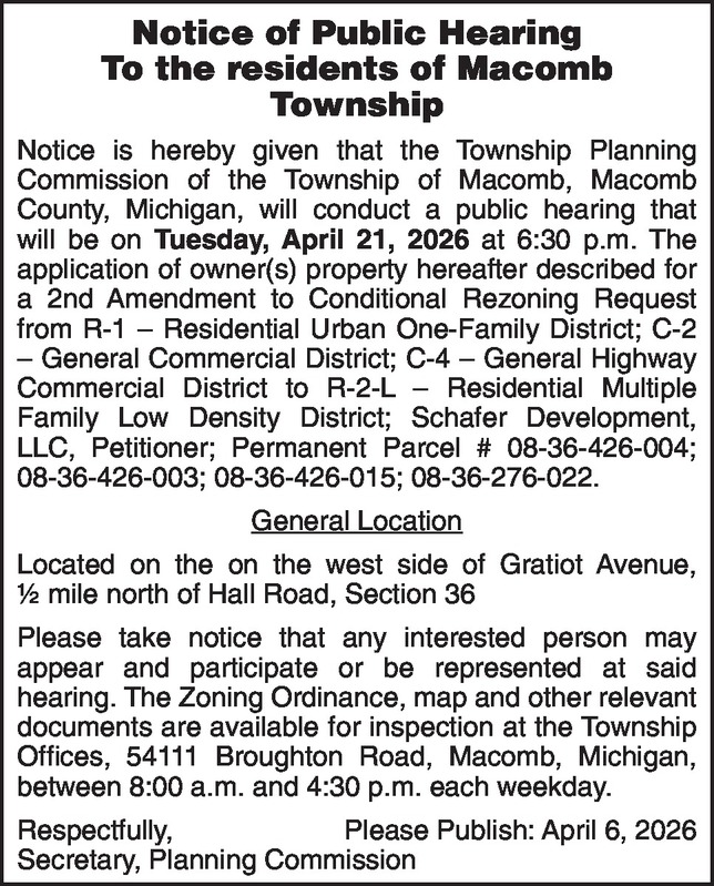 Notice of Public Hearing To the residents of Macomb Township Notice is hereby given that the Township Planning Commission of the Township of Macomb, Macomb County, Michigan, will conduct a public hearing that will be on Tuesday, April 21, 2026 at 6:30 p.m. The application of owner(s) property hereafter described for a 2nd Amendment to Conditional Rezoning Request from R-1 – Residential Urban One-Family District; C-2 – General Commercial District; C-4 – General Highway Commercial District to R-2-L – Residential Multiple Family Low Density District; Schafer Development, LLC, Petitioner; Permanent Parcel # 08-36-426-004; 08-36-426-003; 08-36-426-015; 08-36-276-022. General Location Located on the on the west side of Gratiot Avenue, ½ mile north of Hall Road, Section 36 Please take notice that any interested person may appear and participate or be represented at said hearing. The Zoning Ordinance, map and other relevant documents are available for inspection at the Township Offices, 54111 Broughton Road, Macomb, Michigan, between 8:00 a.m. and 4:30 p.m. each weekday. Respectfully, Please Publish: April 6, 2026 Secretary, Planning Commission