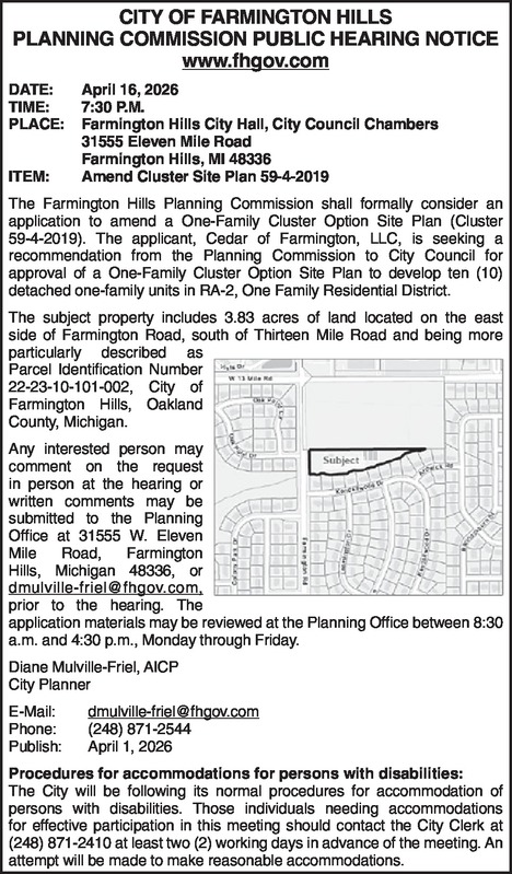 CITY OF FARMINGTON HILLS PLANNING COMMISSION PUBLIC HEARING NOTICE www.fhgov.com DATE: April 16, 2026 TIME: 7:30 P.M. PLACE: Farmington Hills City Hall, City Council Chambers 31555 Eleven Mile Road Farmington Hills, MI 48336 ITEM: Amend Cluster Site Plan 59-4-2019 The Farmington Hills Planning Commission shall formally consider an application to amend a One-Family Cluster Option Site Plan (Cluster 59-4-2019). The applicant, Cedar of Farmington, LLC, is seeking a recommendation from the Planning Commission to City Council for approval of a One-Family Cluster Option Site Plan to develop ten (10) detached one-family units in RA-2, One Family Residential District. The subject property includes 3.83 acres of land located on the east side of Farmington Road, south of Thirteen Mile Road and being more particularly described as Parcel Identification Number 22-23-10-101-002, City of Farmington Hills, Oakland County, Michigan. Any interested person may comment on the request in person at the hearing or written comments may be submitted to the Planning Office at 31555 W. Eleven Mile Road, Farmington Hills, Michigan 48336, or dmulville-friel@fhgov.com, prior to the hearing. The application materials may be reviewed at the Planning Office between 8:30 a.m. and 4:30 p.m., Monday through Friday. Diane Mulville-Friel, AICP City Planner E-Mail: dmulville-friel@fhgov.com Phone: (248) 871-2544 Publish: April 1, 2026 Procedures for accommodations for persons with disabilities: The City will be following its normal procedures for accommodation of persons with disabilities. Those individuals needing accommodations for effective participation in this meeting should contact the City Clerk at (248) 871-2410 at least two (2) working days in advance of the meeting. An attempt will be made to make reasonable accommodations.