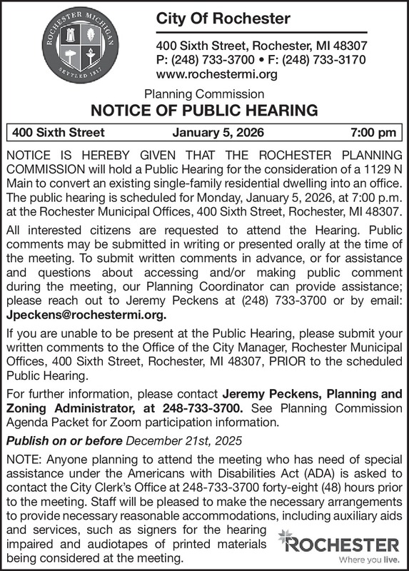 Planning Commission NOTICE OF PUBLIC HEARING 400 Sixth Street January 5, 2026 7:00 pm NOTICE IS HEREBY GIVEN THAT THE ROCHESTER PLANNING COMMISSION will hold a Public Hearing for the consideration of a 1129 N Main to convert an existing single-family residential dwelling into an office. The public hearing is scheduled for Monday, January 5, 2026, at 7:00 p.m. at the Rochester Municipal Offices, 400 Sixth Street, Rochester, MI 48307. All interested citizens are requested to attend the Hearing. Public comments may be submitted in writing or presented orally at the time of the meeting. To submit written comments in advance, or for assistance and questions about accessing and/or making public comment during the meeting, our Planning Coordinator can provide assistance; please reach out to Jeremy Peckens at (248) 733-3700 or by email: Jpeckens@rochestermi.org. If you are unable to be present at the Public Hearing, please submit your written comments to the Office of the City Manager, Rochester Municipal Offices, 400 Sixth Street, Rochester, MI 48307, PRIOR to the scheduled Public Hearing. For further information, please contact Jeremy Peckens, Planning and Zoning Administrator, at 248-733-3700. See Planning Commission Agenda Packet for Zoom participation information. Publish on or before December 21st, 2025 NOTE: Anyone planning to attend the meeting who has need of special assistance under the Americans with Disabilities Act (ADA) is asked to contact the City Clerk’s Office at 248-733-3700 forty-eight (48) hours prior to the meeting. Staff will be pleased to make the necessary arrangements to provide necessary reasonable accommodations, including auxiliary aids and services, such as signers for the hearing impaired and audiotapes of printed materials being considered at the meeting.