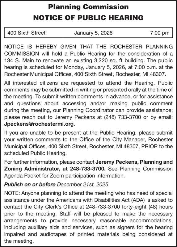Planning Commission NOTICE OF PUBLIC HEARING 400 Sixth Street January 5, 2026 7:00 pm NOTICE IS HEREBY GIVEN THAT THE ROCHESTER PLANNING COMMISSION will hold a Public Hearing for the consideration of a 134 S. Main to renovate an existing 3,220 sq. ft building. The public hearing is scheduled for Monday, January 5, 2026, at 7:00 p.m. at the Rochester Municipal Offices, 400 Sixth Street, Rochester, MI 48307. All interested citizens are requested to attend the Hearing. Public comments may be submitted in writing or presented orally at the time of the meeting. To submit written comments in advance, or for assistance and questions about accessing and/or making public comment during the meeting, our Planning Coordinator can provide assistance; please reach out to Jeremy Peckens at (248) 733-3700 or by email: Jpeckens@rochestermi.org. If you are unable to be present at the Public Hearing, please submit your written comments to the Office of the City Manager, Rochester Municipal Offices, 400 Sixth Street, Rochester, MI 48307, PRIOR to the scheduled Public Hearing. For further information, please contact Jeremy Peckens, Planning and Zoning Administrator, at 248-733-3700. See Planning Commission Agenda Packet for Zoom participation information. Publish on or before December 21st, 2025 NOTE: Anyone planning to attend the meeting who has need of special assistance under the Americans with Disabilities Act (ADA) is asked to contact the City Clerk’s Office at 248-733-3700 forty-eight (48) hours prior to the meeting. Staff will be pleased to make the necessary arrangements to provide necessary reasonable accommodations, including auxiliary aids and services, such as signers for the hearing impaired and audiotapes of printed materials being considered at the meeting.