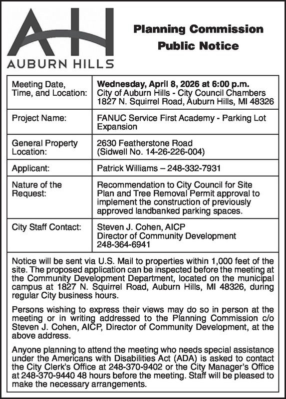Planning Commission Public Notice Meeting Date, Time, and Location: Wednesday, April 8, 2026 at 6:00 p.m. City of Auburn Hills - City Council Chambers 1827 N. Squirrel Road, Auburn Hills, MI 48326 Project Name: FANUC Service First Academy - Parking Lot Expansion General Property Location: 2630 Featherstone Road (Sidwell No. 14-26-226-004) Applicant: Patrick Williams – 248-332-7931 Nature of the Request: Recommendation to City Council for Site Plan and Tree Removal Permit approval to implement the construction of previously approved landbanked parking spaces. City Staff Contact: Steven J. Cohen, AICP Director of Community Development - 248-364-6941 Notice will be sent via U.S. Mail to properties within 1,000 feet of the site. The proposed application can be inspected before the meeting at the Community Development Department, located on the municipal campus at 1827 N. Squirrel Road, Auburn Hills, MI 48326, during regular City business hours. Persons wishing to express their views may do so in person at the meeting or in writing addressed to the Planning Commission c/o Steven J. Cohen, AICP, Director of Community Development, at the above address. Anyone planning to attend the meeting who needs special assistance under the Americans with Disabilities Act (ADA) is asked to contact the City Clerk's Office at 248-370-9402 or the City Manager's Office at 248- 370-9440 48 hours before the meeting. Staff will be pleased to make the necessary arrangements.