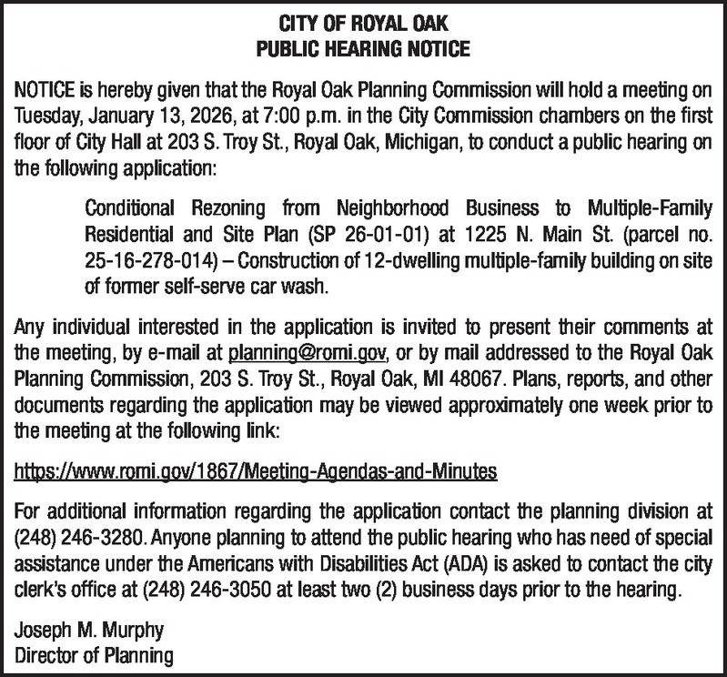 CITY OF ROYAL OAK PUBLIC HEARING NOTICE NOTICE is hereby given that the Royal Oak Planning Commission will hold a meeting on Tuesday, January 13, 2026, at 7:00 p.m. in the City Commission chambers on the first floor of City Hall at 203 S. Troy St., Royal Oak, Michigan, to conduct a public hearing on the following application: Conditional Rezoning from Neighborhood Business to Multiple-Family Residential and Site Plan (SP 26-01-01) at 1225 N. Main St. (parcel no. 25-16-278-014) – Construction of 12-dwelling multiple-family building on site of former self-serve car wash. Any individual interested in the application is invited to present their comments at the meeting, by e-mail at planning@romi.gov, or by mail addressed to the Royal Oak Planning Commission, 203 S. Troy St., Royal Oak, MI 48067. Plans, reports, and other documents regarding the application may be viewed approximately one week prior to the meeting at the following link: https://www.romi.gov/1867/Meeting-Agendas-and-Minutes For additional information regarding the application contact the planning division at (248) 246-3280. Anyone planning to attend the public hearing who has need of special assistance under the Americans with Disabilities Act (ADA) is asked to contact the city clerk’s office at (248) 246-3050 at least two (2) business days prior to the hearing. Joseph M. Murphy Director of Planning