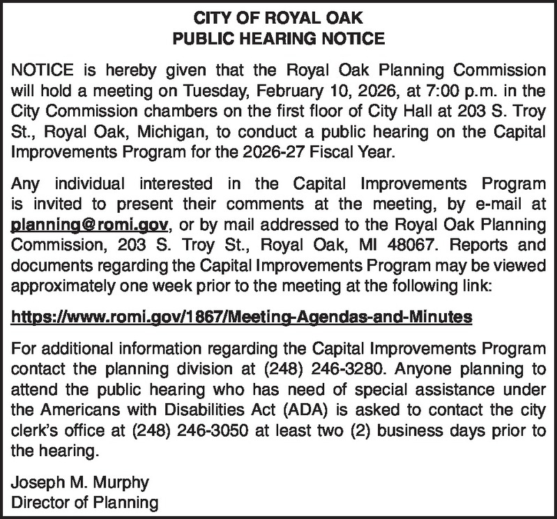 CITY OF ROYAL OAK PUBLIC HEARING NOTICE NOTICE is hereby given that the Royal Oak Planning Commission will hold a meeting on Tuesday, February 10, 2026, at 7:00 p.m. in the City Commission chambers on the first floor of City Hall at 203 S. Troy St., Royal Oak, Michigan, to conduct a public hearing on the Capital Improvements Program for the 2026-27 Fiscal Year. Any individual interested in the Capital Improvements Program is invited to present their comments at the meeting, by e-mail at planning@romi.gov, or by mail addressed to the Royal Oak Planning Commission, 203 S. Troy St., Royal Oak, MI 48067. Reports and documents regarding the Capital Improvements Program may be viewed approximately one week prior to the meeting at the following link: https://www.romi.gov/1867/Meeting-Agendas-and-Minutes For additional information regarding the Capital Improvements Program contact the planning division at (248) 246-3280. Anyone planning to attend the public hearing who has need of special assistance under the Americans with Disabilities Act (ADA) is asked to contact the city clerk’s office at (248) 246-3050 at least two (2) business days prior to the hearing. Joseph M. Murphy Director of Planning