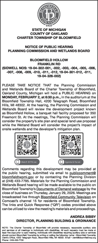 STATE OF MICHIGAN COUNTY OF OAKLAND CHARTER TOWNSHIP OF BLOOMFIELD NOTICE OF PUBLIC HEARING PLANNING COMMISSION AND WETLANDS BOARD BLOOMFIELD HOLLOW FRANKLIN RD (SIDWELL NOS: 19-04-302-001, -002, -003, -004, -005, -006, -007, -008, -009, -010, -011, -012, 19-04-301-012, -011, 19-04-326-002) PLEASE TAKE NOTICE THAT the Planning Commission and Wetlands Board of the Charter Township of Bloomfield, Oakland County, Michigan will hold a PUBLIC HEARING on MONDAY, FEBRUARY 2, at 6:30 p.m., in the auditorium at the Bloomfield Township Hall, 4200 Telegraph Road, Bloomfield Hills, MI 48302. At the hearing, the Planning Commission and Wetlands Board will review the development project known as Bloomfield Hollow, a banquet hall facility proposed for 350 Freemont St. At the meetings, The Planning Commission will consider the property’s site plan and special land use proposal while the Wetland Board will consider the project’s impact of onsite wetlands and the developer’s mitigation plan. Comments regarding this development may be provided at the public hearing, submitted via email to publiccomment@bloomfieldtwpmi.gov or by contacting the Planning Division at (248) 433-7795. Materials for the Planning Commission and Wetlands Board hearing will be made available to the public on Bloomfield Township’s Documents of Demand webpage by the close of business on Thursday, January 29, 2026. Meetings are broadcasted live through Bloomfield Community Television on Comcast's channel 15 for residents of Bloomfield Township. The links and Quick Response (“QR”) codes provided above can be utilized to view the meeting’s materials and proceedings. ANDREA BIBBY DIRECTOR, PLANNING BUILDING & ORDINANCE NOTE: The Charter Township of Bloomfield will provide necessary, reasonable auxiliary aids and services at all meetings to individuals with disabilities. All such requests must be made at least five days prior to said meeting. Individuals with disabilities requiring auxiliary aids or services should contact Bloomfield Township by writing or calling the following: Letter • Bloomfield Township Clerk’s Office, 4200 Telegraph Road, Bloomfield Hills, MI 48302. Email • clerk@bloomfieldtwp.org Phone • 248-433-7702.