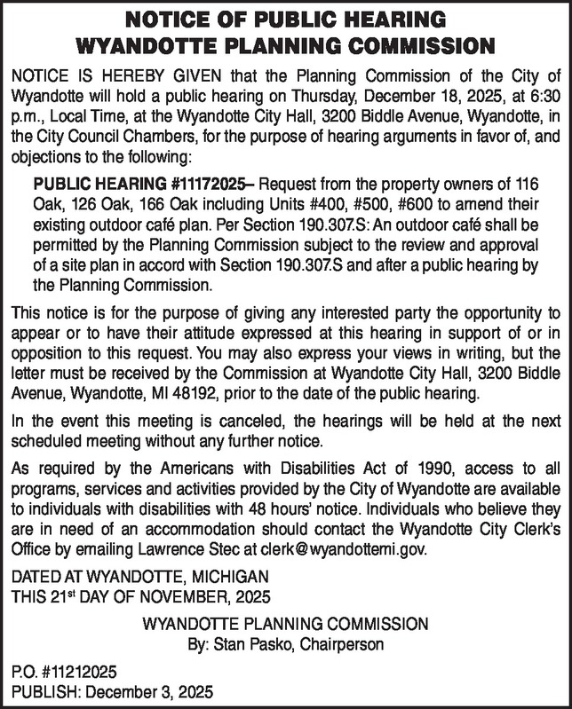 NOTICE OF PUBLIC HEARING WYANDOTTE PLANNING COMMISSION NOTICE IS HEREBY GIVEN that the Planning Commission of the City of Wyandotte will hold a public hearing on Thursday, December 18, 2025, at 6:30 p.m., Local Time, at the Wyandotte City Hall, 3200 Biddle Avenue, Wyandotte, in the City Council Chambers, for the purpose of hearing arguments in favor of, and objections to the following: PUBLIC HEARING #11172025– Request from the property owners of 116 Oak, 126 Oak, 166 Oak including Units #400, #500, #600 to amend their existing outdoor café plan. Per Section 190.307.S: An outdoor café shall be permitted by the Planning Commission subject to the review and approval of a site plan in accord with Section 190.307.S and after a public hearing by the Planning Commission. This notice is for the purpose of giving any interested party the opportunity to appear or to have their attitude expressed at this hearing in support of or in opposition to this request. You may also express your views in writing, but the letter must be received by the Commission at Wyandotte City Hall, 3200 Biddle Avenue, Wyandotte, MI 48192, prior to the date of the public hearing. In the event this meeting is canceled, the hearings will be held at the next scheduled meeting without any further notice. As required by the Americans with Disabilities Act of 1990, access to all programs, services and activities provided by the City of Wyandotte are available to individuals with disabilities with 48 hours’ notice. Individuals who believe they are in need of an accommodation should contact the Wyandotte City Clerk’s Office by emailing Lawrence Stec at clerk@wyandottemi.gov. DATED AT WYANDOTTE, MICHIGAN THIS 21st DAY OF NOVEMBER, 2025 WYANDOTTE PLANNING COMMISSION By: Stan Pasko, Chairperson P.O. #11212025 PUBLISH: December 3, 2025