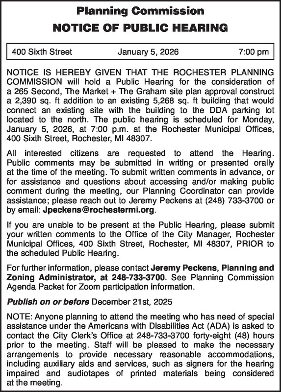Planning Commission NOTICE OF PUBLIC HEARING 400 Sixth Street January 5, 2026 7:00 pm NOTICE IS HEREBY GIVEN THAT THE ROCHESTER PLANNING COMMISSION will hold a Public Hearing for the consideration of a 265 Second, The Market + The Graham site plan approval construct a 2,390 sq. ft addition to an existing 5,268 sq. ft building that would connect an existing site with the building to the DDA parking lot located to the north. The public hearing is scheduled for Monday, January 5, 2026, at 7:00 p.m. at the Rochester Municipal Offices, 400 Sixth Street, Rochester, MI 48307. All interested citizens are requested to attend the Hearing. Public comments may be submitted in writing or presented orally at the time of the meeting. To submit written comments in advance, or for assistance and questions about accessing and/or making public comment during the meeting, our Planning Coordinator can provide assistance; please reach out to Jeremy Peckens at (248) 733-3700 or by email: Jpeckens@rochestermi.org. If you are unable to be present at the Public Hearing, please submit your written comments to the Office of the City Manager, Rochester Municipal Offices, 400 Sixth Street, Rochester, MI 48307, PRIOR to the scheduled Public Hearing. For further information, please contact Jeremy Peckens, Planning and Zoning Administrator, at 248-733-3700. See Planning Commission Agenda Packet for Zoom participation information. Publish on or before December 21st, 2025 NOTE: Anyone planning to attend the meeting who has need of special assistance under the Americans with Disabilities Act (ADA) is asked to contact the City Clerk’s Office at 248-733-3700 forty-eight (48) hours prior to the meeting. Staff will be pleased to make the necessary arrangements to provide necessary reasonable accommodations, including auxiliary aids and services, such as signers for the hearing impaired and audiotapes of printed materials being considered at the meeting.