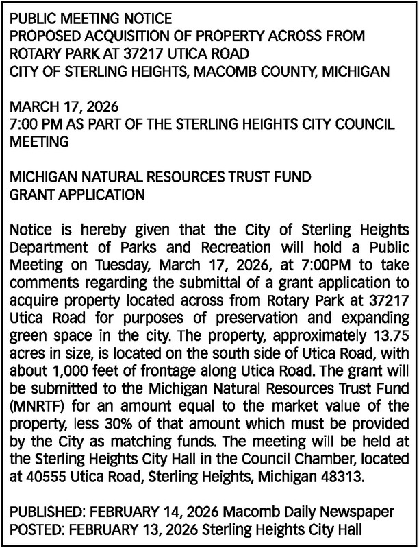 PUBLIC MEETING NOTICE PROPOSED ACQUISITION OF PROPERTY ACROSS FROM ROTARY PARK AT 37217 UTICA ROAD CITY OF STERLING HEIGHTS, MACOMB COUNTY, MICHIGAN MARCH 17, 2026 7:00 PM AS PART OF THE STERLING HEIGHTS CITY COUNCIL MEETING MICHIGAN NATURAL RESOURCES TRUST FUND GRANT APPLICATION Notice is hereby given that the City of Sterling Heights Department of Parks and Recreation will hold a Public Meeting on Tuesday, March 17, 2026, at 7:00PM to take comments regarding the submittal of a grant application to acquire property located across from Rotary Park at 37217 Utica Road for purposes of preservation and expanding green space in the city. The property, approximately 13.75 acres in size, is located on the south side of Utica Road, with about 1,000 feet of frontage along Utica Road. The grant will be submitted to the Michigan Natural Resources Trust Fund (MNRTF) for an amount equal to the market value of the property, less 30% of that amount which must be provided by the City as matching funds. The meeting will be held at the Sterling Heights City Hall in the Council Chamber, located at 40555 Utica Road, Sterling Heights, Michigan 48313. PUBLISHED: FEBRUARY 14, 2026 Macomb Daily Newspaper POSTED: FEBRUARY 13, 2026 Sterling Heights City Hall