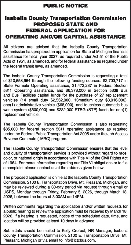PUBLIC NOTICE Isabella County Transportation Commission PROPOSED STATE AND FEDERAL APPLICATION FOR OPERATING AND/OR CAPITAL ASSISTANCE All citizens are advised that the Isabella County Transportation Commission has prepared an application for State of Michigan financial assistance for fiscal year 2027, as required under Act 51 of the Public Acts of 1951, as amended, and for federal assistance as required under the federal transit laws, as amended. The Isabella County Transportation Commission is requesting a total of $10,553,954 through the following funding sources: $2,703,717 in State Formula Operating assistance, $1,472,237 in Federal Section 5311 Operating assistance, and $6,378,000 in Section 5339 Bus and Bus Facilities capital funds for the purchase of 27 replacement vehicles (14 small duty $2,562,000, 13medium duty $3,016,000), one(1) administrative vehicle ($68,000), and touchless automatic bus wash system ($500,000) and $232,000 STBG (STP) funds for one(1) replacement vehicle. The Isabella County Transportation Commission is also requesting $85,000 for federal section 5311 operating assistance as required under the Federal Public Transportation Act 2005 under the Job Access Reverse Commute (JARC) program. The Isabella County Transportation Commission ensures that the level and quality of transportation service is provided without regard to race, color, or national origin in accordance with Title VI of the Civil Rights Act of 1964. For more information regarding our Title VI obligations or to file a complaint please contact us at the address given below. The proposed application is on file at the Isabella County Transportation Commission, 2100 E. Transportation Drive, Mt. Pleasant, Michigan, and may be reviewed during a 30-day period via request through email or USPS, Monday through Friday, February 5, 2026, through March 18, 2026, between the hours of 8:00AM and 4PM. Written comments regarding the application and/or written requests for a public hearing to review the application must be received by March 18, 2026. If a hearing is requested, notice of the scheduled date, time, and location will be provided at least 10 days in advance. Submittals should be mailed to Kelly Crofoot, HR Manager, Isabella County Transportation Commission, 2100 E. Transportation Drive, Mt. Pleasant, Michigan or via email to info@ictcbus.com.