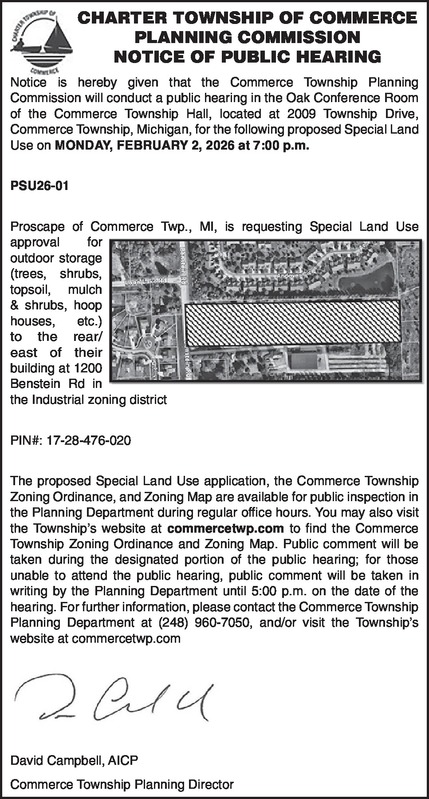CHARTER TOWNSHIP OF COMMERCE PLANNING COMMISSION NOTICE OF PUBLIC HEARING Notice is hereby given that the Commerce Township Planning Commission will conduct a public hearing in the Oak Conference Room of the Commerce Township Hall, located at 2009 Township Drive, Commerce Township, Michigan, for the following proposed Special Land Use on MONDAY, FEBRUARY 2, 2026 at 7:00 p.m. PSU26-01 Proscape of Commerce Twp., MI, is requesting Special Land Use approval for outdoor storage (trees, shrubs, topsoil, mulch & shrubs, hoop houses, etc.) to the rear / east of their building at 1200 Benstein Rd in the Industrial zoning district PIN#: 17-28-476-020 The proposed Special Land Use application, the Commerce Township Zoning Ordinance, and Zoning Map are available for public inspection in the Planning Department during regular office hours. You may also visit the Township’s website at commercetwp.com to find the Commerce Township Zoning Ordinance and Zoning Map. Public comment will be taken during the designated portion of the public hearing; for those unable to attend the public hearing, public comment will be taken in writing by the Planning Department until 5:00 p.m. on the date of the hearing. For further information, please contact the Commerce Township Planning Department at (248) 960-7050, and/or visit the Township’s website at commercetwp.com David Campbell, AICP Commerce Township Planning Director