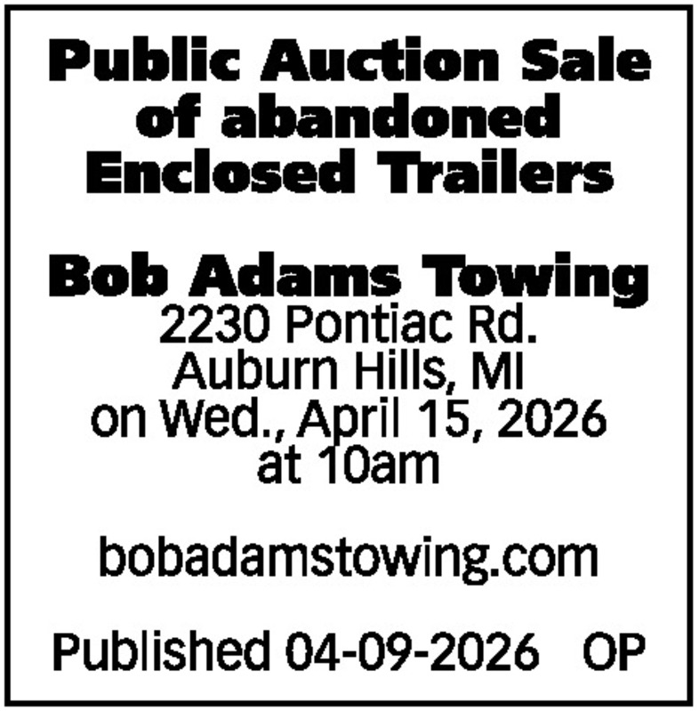 Public Auction Sale of abandoned Enclosed Trailers Bob Adams Towing 2230 Pontiac Rd. Auburn Hills, MI on Wed., April 15, 2026 at 10am bobadamstowing.com Published 04-09-2026 OP