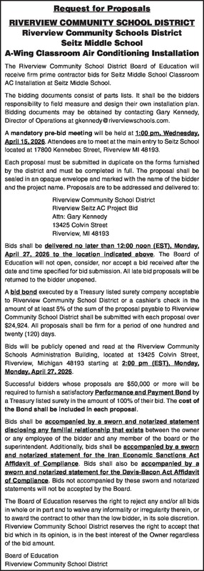 Request for Proposals RIVERVIEW COMMUNITY SCHOOL DISTRICT Riverview Community Schools District – Seitz Middle School A-Wing Classroom Air Conditioning Installation The Riverview Community School District Board of Education will receive firm prime contractor bids for Seitz Middle School Classroom AC Installation at Seitz Middle School. The bidding documents consist of parts lists. It shall be the bidders responsibility to field measure and design their own installation plan. Bidding documents may be obtained by contacting Gary Kennedy, Director of Operations at gkennedy@riverviewschools.com. A mandatory pre-bid meeting will be held at 1:00 pm, Wednesday, April 15, 2026. Attendees are to meet at the main entry to Seitz School located at 17800 Kennebec Street, Riverview MI 48193. Each proposal must be submitted in duplicate on the forms furnished by the district and must be completed in full. The proposal shall be sealed in an opaque envelope and marked with the name of the bidder and the project name. Proposals are to be addressed and delivered to: Riverview Community School District Riverview Seitz AC Project Bid Attn: Gary Kennedy 13425 Colvin Street Riverview, MI 48193 Bids shall be delivered no later than 12:00 noon (EST), Monday, April 27, 2026 to the location indicated above. The Board of Education will not open, consider, nor accept a bid received after the date and time specified for bid submission. All late bid proposals will be returned to the bidder unopened. A bid bond executed by a Treasury listed surety company acceptable to Riverview Community School District or a cashier's check in the amount of at least 5% of the sum of the proposal payable to Riverview Community School District shall be submitted with each proposal over $24,924. All proposals shall be firm for a period of one hundred and twenty (120) days. Bids will be publicly opened and read at the Riverview Community Schools Administration Building, located at 13425 Colvin Street, Riverview, Michigan 48193 starting at 2:00 pm (EST), Monday, Monday, April 27, 2026. Successful bidders whose proposals are $50,000 or more will be required to furnish a satisfactory Performance and Payment Bond by a Treasury listed surety in the amount of 100% of their bid. The cost of the Bond shall be included in each proposal. Bids shall be accompanied by a sworn and notarized statement disclosing any familial relationship that exists between the owner or any employee of the bidder and any member of the board or the superintendent. Additionally, bids shall be accompanied by a sworn and notarized statement for the Iran Economic Sanctions Act Affidavit of Compliance. Bids shall also be accompanied by a sworn and notarized statement for the Davis-Bacon Act Affidavit of Compliance. Bids not accompanied by these sworn and notarized statements will not be accepted by the Board. The Board of Education reserves the right to reject any and/or all bids in whole or in part and to waive any informality or irregularity therein, or to award the contract to other than the low bidder, in its sole discretion. Riverview Community School District reserves the right to accept that bid which in its opinion, is in the best interest of the Owner regardless of the bid amount. Board of Education Riverview Community School District
