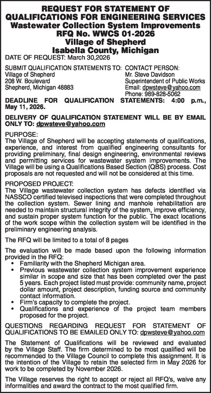 REQUEST FOR STATEMENT OF QUALIFICATIONS FOR ENGINEERING SERVICES Wastewater Collection System Improvements RFQ No. WWCS 01-2026 Village of Shepherd Isabella County, Michigan DATE OF REQUEST: March 30,2026 SUBMIT QUALIFICATION STATEMENTS TO: CONTACT PERSON: Village of Shepherd Mr. Steve Davidson 208 W. Boulevard Superintendent of Public Works Shepherd, Michigan 48883 Email: dpwsteve@yahoo.com Phone: 989-828-5062 DEADLINE FOR QUALIFICATION STATEMENTS: 4:00 p.m., May 5,2026 DELIVERY OF QUALIFICATION STATEMENT WILL BE BY EMAIL ONLY TO: dpwsteve@yahoo.com PURPOSE: The Village of Shepherd will be accepting statements of qualifications, experience, and interest from qualified engineering consultants for providing preliminary, final design engineering, environmental reviews and permitting services for wastewater system improvements. The Village will be using a Qualifications Based Section (QBS) process. Cost proposals are not requested and will not be considered at this time. PROPOSED PROJECT: The Village wastewater collection system has defects identified via NASSCO certified televised inspections that were completed throughout the collection system. Sewer lining and manhole rehabilitation are needed to maintain structural integrity of the system, improve efficiency, and sustain proper system function for the public. The exact locations of the work scope within the collection system will be identified in the preliminary engineering analysis. The RFQ will be limited to a total of 8 pages The evaluation will be made based upon the following information provided in the RFQ: • Familiarity with the Shepherd Michigan area. • Previous wastewater collection system improvement experience similar in scope and size that has been completed over the past 5 years. Each project listed must provide: community name, project dollar amount, project description, funding source and community contact information. • Firm’s capacity to complete the project. • Qualifications and experience of the project team members proposed for the project. QUESTIONS REGARDING REQUEST FOR STATEMENT OF QUALIFICATIONS TO BE EMAILED ONLY TO: dpwsteve@yahoo.com The Statement of Qualifications will be reviewed and evaluated by the Village Staff. The firm determined to be most qualified will be recommended to the Village Council to complete this assignment. It is the intention of the Village to retain the selected firm in May 2026 for work to be completed by November 2026. The Village reserves the right to accept or reject all RFQ’s, waive any informalities and award the contract to the most qualified firm.