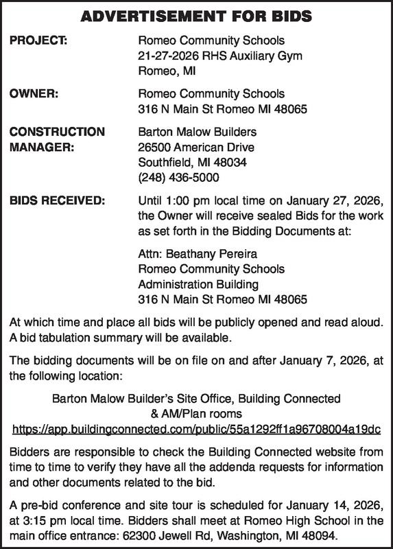 ADVERTISEMENT FOR BIDS PROJECT: Romeo Community Schools 21-27-2025 RHS Auxiliary Gym Romeo, MI OWNER: Romeo Community Schools 316 N Main St Romeo MI 48065 CONSTRUCTION Barton Malow Builders MANAGER: 26500 American Drive Southfield, MI 48034 (248) 436-5000 BIDS RECEIVED: Until 1:00 pm local time on January 27, 2026, the Owner will receive sealed Bids for the work as set forth in the Bidding Documents at: Attn: Beathany Pereira Romeo Community Schools Administration Building 316 N Main St Romeo MI 48065 At which time and place all bids will be publicly opened and read aloud. A bid tabulation summary will be available. The bidding documents will be on file on and after January 7, 2026, at the following location: Barton Malow Builder’s Site Office, Building Connected & AM/Plan rooms https://app.buildingconnected.com/public/55a1292ff1a96708004a19dc Bidders are responsible to check the Building Connected website from time to time to verify they have all the addenda requests for information and other documents related to the bid. A pre-bid conference and site tour is scheduled for January 14, 2026, at 3:15 pm local time. Bidders shall meet at Romeo High School in the main office entrance: 62300 Jewell Rd, Washington, MI 48094.