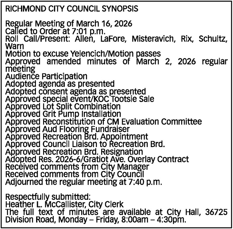 RICHMOND CITY COUNCIL SYNOPSIS Regular Meeting of March 16, 2026 Called to Order at 7:01 p.m. Roll Call/Present: Allen, LaFore, Misteravich, Rix, Schultz, Warn Motion to excuse Yelencich/Motion passes Approved amended minutes of March 2, 2026 regular meeting Audience Participation Adopted agenda as presented Adopted consent agenda as presented Approved special event/KOC Tootsie Sale Approved Lot Split Combination Approved Grit Pump Installation Approved Reconstitution of CM Evaluation Committee Approved Aud Flooring Fundraiser Approved Recreation Brd. Appointment Approved Council Liaison to Recreation Brd. Approved Recreation Brd. Resignation Adopted Res. 2026-6/Gratiot Ave. Overlay Contract Received comments from City Manager Received comments from City Council Adjourned the regular meeting at 7:40 p.m. Respectfully submitted: Heather L. McCallister, City Clerk The full text of minutes are available at City Hall, 36725 Division Road, Monday – Friday, 8:00am – 4:30pm.