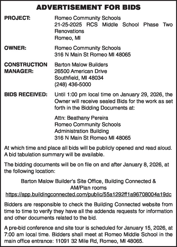 ADVERTISEMENT FOR BIDS PROJECT: Romeo Community Schools 21-25-2025 RCS Middle School Phase Two Renovations Romeo, MI OWNER: Romeo Community Schools 316 N Main St Romeo MI 48065 CONSTRUCTION Barton Malow Builders MANAGER: 26500 American Drive Southfield, MI 48034 (248) 436-5000 BIDS RECEIVED: Until 1:00 pm local time on January 29, 2026, the Owner will receive sealed Bids for the work as set forth in the Bidding Documents at: Attn: Beathany Pereira Romeo Community Schools Administration Building 316 N Main St Romeo MI 48065 At which time and place all bids will be publicly opened and read aloud. A bid tabulation summary will be available. The bidding documents will be on file on and after January 8, 2026, at the following location: Barton Malow Builder’s Site Office, Building Connected & AM/Plan rooms https://app.buildingconnected.com/public/55a1292ff1a96708004a19dc Bidders are responsible to check the Building Connected website from time to time to verify they have all the addenda requests for information and other documents related to the bid. A pre-bid conference and site tour is scheduled for January 15, 2026, at 7:00 am local time. Bidders shall meet at Romeo Middle School in the main office entrance: 11091 32 Mile Rd, Romeo, MI 48065.