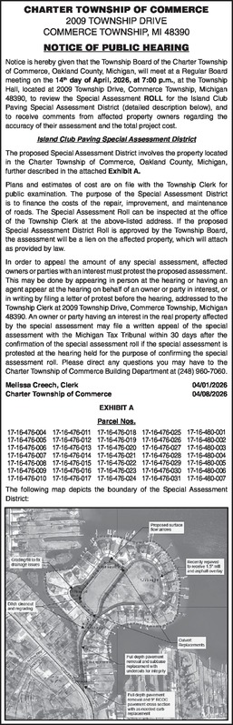 CHARTER TOWNSHIP OF COMMERCE 2009 TOWNSHIP DRIVE COMMERCE TOWNSHIP, MI 48390 NOTICE OF PUBLIC HEARING Notice is hereby given that the Township Board of the Charter Township of Commerce, Oakland County, Michigan, will meet at a Regular Board meeting on the 14th day of April, 2026, at 7:00 p.m., at the Township Hall, located at 2009 Township Drive, Commerce Township, Michigan 48390, to review the Special Assessment ROLL for the Island Club Paving Special Assessment District (detailed description below), and to receive comments from affected property owners regarding the accuracy of their assessment and the total project cost. Island Club Paving Special Assessment District The proposed Special Assessment District involves the property located in the Charter Township of Commerce, Oakland County, Michigan, further described in the attached Exhibit A. Plans and estimates of cost are on file with the Township Clerk for public examination. The purpose of the Special Assessment District is to finance the costs of the repair, improvement, and maintenance of roads. The Special Assessment Roll can be inspected at the office of the Township Clerk at the above-listed address. If the proposed Special Assessment District Roll is approved by the Township Board, the assessment will be a lien on the affected property, which will attach as provided by law. In order to appeal the amount of any special assessment, affected owners or parties with an interest must protest the proposed assessment. This may be done by appearing in person at the hearing or having an agent appear at the hearing on behalf of an owner or party in interest, or in writing by filing a letter of protest before the hearing, addressed to the Township Clerk at 2009 Township Drive, Commerce Township, Michigan 48390. An owner or party having an interest in the real property affected by the special assessment may file a written appeal of the special assessment with the Michigan Tax Tribunal within 30 days after the confirmation of the special assessment roll if the special assessment is protested at the hearing held for the purpose of confirming the special assessment roll. Please direct any questions you may have to the Charter Township of Commerce Building Department at (248) 960-7060. Melissa Creech, Clerk 04/01/2026 Charter Township of Commerce 04/08/2026 Parcel Nos. 17-16-476-004 17-16-476-005 17-16-476-006 17-16-476-007 17-16-476-008 17-16-476-009 17-16-476-010 17-16-476-011 17-16-476-012 17-16-476-013 17-16-476-014 17-16-476-015 17-16-476-016 17-16-476-017 17-16-476-018 17-16-476-019 17-16-476-020 17-16-476-021 17-16-476-022 17-16-476-023 17-16-476-024 17-16-476-025 17-16-476-026 17-16-476-027 17-16-476-028 17-16-476-029 17-16-476-030 17-16-476-031 17-16-480-001 17-16-480-002 17-16-480-003 17-16-480-004 17-16-480-005 17-16-480-006 17-16-480-007 The following map depicts the boundary of the Special Assessment District: