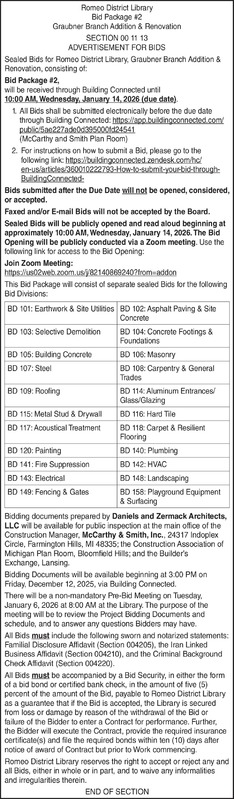 Romeo District Library Bid Package #2 Graubner Branch Addition & Renovation SECTION 00 11 13 ADVERTISEMENT FOR BIDS Sealed Bids for Romeo District Library, Graubner Branch Addition & Renovation, consisting of: Bid Package #2, will be received through Building Connected until 10:00 AM, Wednesday, January 14, 2026 (due date). 1. All Bids shall be submitted electronically before the due date through Building Connected: https://app.buildingconnected.com/public/5ae227ade0d395000fd24541 (McCarthy and Smith Plan Room) 2. For instructions on how to submit a Bid, please go to the following link: https://buildingconnected.zendesk.com/hc/en-us/articles/360010222793-How-to- submit-your-bid-through-BuildingConnected- Bids submitted after the Due Date will not be opened, considered, or accepted. Faxed and/or E-mail Bids will not be accepted by the Board. Sealed Bids will be publicly opened and read aloud beginning at approximately 10:00 AM, Wednesday, January 14, 2026. The Bid Opening will be publicly conducted via a Zoom meeting. Use the following link for access to the Bid Opening: Join Zoom Meeting: https://us02web.zoom.us/j/82140869240?from=addon This Bid Package will consist of separate sealed Bids for the following Bid Divisions: BD 101: Earthwork & Site Utilities BD 102: Asphalt Paving & Site Concrete BD 103: Selective Demolition BD 104: Concrete Footings & Foundations BD 105: Building Concrete BD 106: Masonry BD 107: Steel BD 108: Carpentry & General Trades BD 109: Roofing BD 114: Aluminum Entrances/Glass/Glazing BD 115: Metal Stud & Drywall BD 116: Hard Tile BD 117: Acoustical Treatment BD 118: Carpet & Resilient Flooring BD 120: Painting BD 140: Plumbing BD 141: Fire Suppression BD 142: HVAC BD 143: Electrical BD 148: Landscaping BD 149: Fencing & Gates BD 158: Playground Equipment & Surfacing Bidding documents prepared by Daniels and Zermack Architects, LLC will be available for public inspection at the main office of the Construction Manager, McCarthy & Smith, Inc., 24317 Indoplex Circle, Farmington Hills, MI 48335; the Construction Association of Michigan Plan Room, Bloomfield Hills; and the Builder’s Exchange, Lansing. Bidding Documents will be available beginning at 3:00 PM on Friday, December 12, 2025, via Building Connected. There will be a non-mandatory Pre-Bid Meeting on Tuesday, January 6, 2026 at 8:00 AM at the Library. The purpose of the meeting will be to review the Project Bidding Documents and schedule, and to answer any questions Bidders may have. All Bids must include the following sworn and notarized statements: Familial Disclosure Affidavit (Section 004205), the Iran Linked Business Affidavit (Section 004210), and the Criminal Background Check Affidavit (Section 004220). All Bids must be accompanied by a Bid Security, in either the form of a bid bond or certified bank check, in the amount of five (5) percent of the amount of the Bid, payable to Romeo District Library as a guarantee that if the Bid is accepted, the Library is secured from loss or damage by reason of the withdrawal of the Bid or failure of the Bidder to enter a Contract for performance. Further, the Bidder will execute the Contract, provide the required insurance certificate(s) and file the required bonds within ten (10) days after notice of award of Contract but prior to Work commencing. Romeo District Library reserves the right to accept or reject any and all Bids, either in whole or in part, and to waive any informalities and irregularities therein.