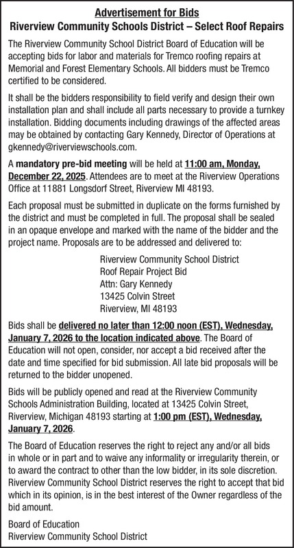 Advertisement for Bids Riverview Community Schools District – Select Roof Repairs The Riverview Community School District Board of Education will be accepting bids for labor and materials for Tremco roofing repairs at Memorial and Forest Elementary Schools. All bidders must be Tremco certified to be considered. It shall be the bidders responsibility to field verify and design their own installation plan and shall include all parts necessary to provide a turnkey installation. Bidding documents including drawings of the affected areas may be obtained by contacting Gary Kennedy, Director of Operations at gkennedy@riverviewschools.com. A mandatory pre-bid meeting will be held at 11:00 am, Monday, December 22, 2025. Attendees are to meet at the Riverview Operations Office at 11881 Longsdorf Street, Riverview MI 48193. Each proposal must be submitted in duplicate on the forms furnished by the district and must be completed in full. The proposal shall be sealed in an opaque envelope and marked with the name of the bidder and the project name. Proposals are to be addressed and delivered to: Riverview Community School District Roof Repair Project Bid Attn: Gary Kennedy 13425 Colvin Street Riverview, MI 48193 Bids shall be delivered no later than 12:00 noon (EST), Wednesday, January 7, 2026 to the location indicated above. The Board of Education will not open, consider, nor accept a bid received after the date and time specified for bid submission. All late bid proposals will be returned to the bidder unopened. Bids will be publicly opened and read at the Riverview Community Schools Administration Building, located at 13425 Colvin Street, Riverview, Michigan 48193 starting at 1:00 pm (EST), Wednesday, January 7, 2026. The Board of Education reserves the right to reject any and/or all bids in whole or in part and to waive any informality or irregularity therein, or to award the contract to other than the low bidder, in its sole discretion. Riverview Community School District reserves the right to accept that bid which in its opinion, is in the best interest of the Owner regardless of the bid amount. Board of Education Riverview Community School District