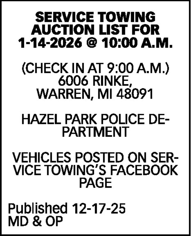 SERVICE TOWING AUCTION LIST FOR 1-14-2026 @ 10:00 A.M. (CHECK IN AT 9:00 A.M.) 6006 RINKE, WARREN, MI 48091 HAZEL PARK POLICE DEPARTMENT VEHICLES POSTED ON SERVICE TOWING’S FACEBOOK PAGE Published 12-17-25 MD & OP