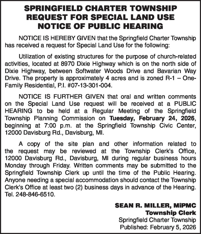 SPRINGFIELD CHARTER TOWNSHIP REQUEST FOR SPECIAL LAND USE NOTICE OF PUBLIC HEARING NOTICE IS HEREBY GIVEN that the Springfield Charter Township has received a request for Special Land Use for the following: Utilization of existing structures for the purpose of church-related activities, located at 8970 Dixie Highway which is on the north side of Dixie Highway, between Softwater Woods Drive and Bavarian Way Drive. The property is approximately 4 acres and is zoned R-1 – One-Family Residential, P.I. #07-13-301-004. NOTICE IS FURTHER GIVEN that oral and written comments on the Special Land Use request will be received at a PUBLIC HEARING to be held at a Regular Meeting of the Springfield Township Planning Commission on Tuesday, February 24, 2026, beginning at 7:00 p.m. at the Springfield Township Civic Center, 12000 Davisburg Rd., Davisburg, MI. A copy of the site plan and other information related to the request may be reviewed at the Township Clerk's Office, 12000 Davisburg Rd., Davisburg, MI during regular business hours Monday through Friday. Written comments may be submitted to the Springfield Township Clerk up until the time of the Public Hearing. Anyone needing a special accommodation should contact the Township Clerk's Office at least two (2) business days in advance of the Hearing. Tel. 248-846-6510. SEAN R. MILLER, MiPMC Township Clerk Springfield Charter Township Published: February 5, 2026