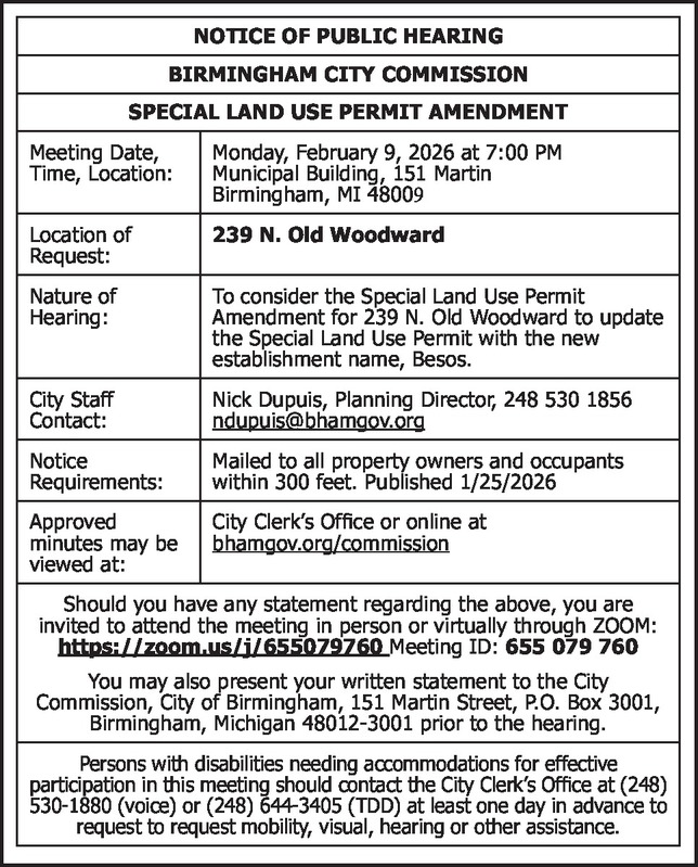 NOTICE OF PUBLIC HEARING BIRMINGHAM CITY COMMISSION SPECIAL LAND USE PERMIT AMENDMENT Meeting Date, Time, Location: Monday, February 9, 2026 at 7:00 PM Municipal Building, 151 Martin Birmingham, MI 48009 Location of Request: 239 N. Old Woodward Nature of Hearing: To consider the Special Land Use Permit Amendment for 239 N. Old Woodward to update the Special Land Use Permit with the new establishment name, Besos. City Staff Contact: Nick Dupuis, Planning Director, 248 530 1856 ndupuis@bhamgov.org Notice Requirements: Mailed to all property owners and occupants within 300 feet. Published 1/25/2026 Approved minutes may be viewed at: City Clerk’s Office or online at bhamgov.org/commission Should you have any statement regarding the above, you are invited to attend the meeting in person or virtually through ZOOM: https://zoom.us/j/655079760 Meeting ID: 655 079 760 You may also present your written statement to the City Commission, City of Birmingham, 151 Martin Street, P.O. Box 3001, Birmingham, Michigan 48012-3001 prior to the hearing. Persons with disabilities needing accommodations for effective participation in this meeting should contact the City Clerk's Office at (248) 530-1880 (voice) or (248) 644-3405 (TDD) at least one day in advance to request to request mobility, visual, hearing or other assistance.