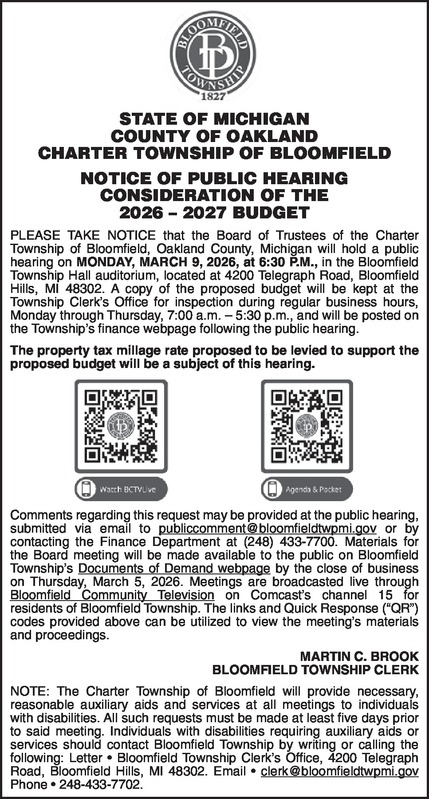 STATE OF MICHIGAN COUNTY OF OAKLAND CHARTER TOWNSHIP OF BLOOMFIELD NOTICE OF PUBLIC HEARING CONSIDERATION OF THE 2026 – 2027 BUDGET PLEASE TAKE NOTICE that the Board of Trustees of the Charter Township of Bloomfield, Oakland County, Michigan will hold a public hearing on MONDAY, MARCH 9, 2026, at 6:30 P.M., in the Bloomfield Township Hall auditorium, located at 4200 Telegraph Road, Bloomfield Hills, MI 48302. A copy of the proposed budget will be kept at the Township Clerk’s Office for inspection during regular business hours, Monday through Thursday, 7:00 a.m. – 5:30 p.m., and will be posted on the Township’s finance webpage following the public hearing. The property tax millage rate proposed to be levied to support the proposed budget will be a subject of this hearing. Comments regarding this request may be provided at the public hearing, submitted via email to publiccomment@bloomfieldtwpmi.gov or by contacting the Finance Department at (248) 433-7700. Materials for the Board meeting will be made available to the public on Bloomfield Township’s Documents of Demand webpage by the close of business on Thursday, March 5, 2026. Meetings are broadcasted live through Bloomfield Community Television on Comcast's channel 15 for residents of Bloomfield Township. The links and Quick Response (“QR”) codes provided above can be utilized to view the meeting’s materials and proceedings. MARTIN C. BROOK BLOOMFIELD TOWNSHIP CLERK NOTE: The Charter Township of Bloomfield will provide necessary, reasonable auxiliary aids and services at all meetings to individuals with disabilities. All such requests must be made at least five days prior to said meeting. Individuals with disabilities requiring auxiliary aids or services should contact Bloomfield Township by writing or calling the following: Letter • Bloomfield Township Clerk’s Office, 4200 Telegraph Road, Bloomfield Hills, MI 48302. Email • clerk@bloomfieldtwpmi.gov Phone • 248-433-7702.