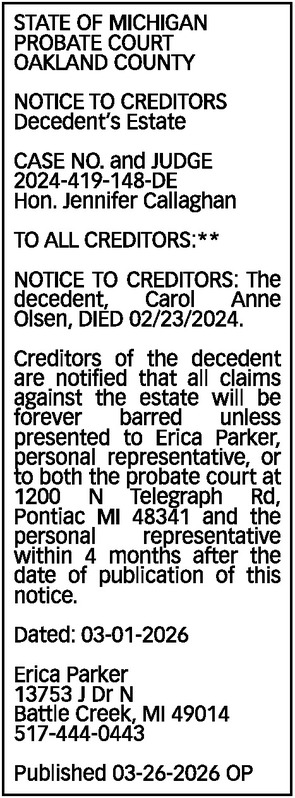 STATE OF MICHIGAN PROBATE COURT OAKLAND COUNTY NOTICE TO CREDITORS Decedent’s Estate CASE NO. and JUDGE 2024-419-148-DE Hon. Jennifer Callaghan TO ALL CREDITORS:** NOTICE TO CREDITORS: The decedent, Carol Anne Olsen, DIED 02/23/2024. Creditors of the decedent are notified that all claims against the estate will be forever barred unless presented to Erica Parker, personal representative, or to both the probate court at 1200 N Telegraph Rd, Pontiac MI 48341 and the personal representative within 4 months after the date of publication of this notice. Dated: 03-01-2026 Erica Parker 13753 J Dr N Battle Creek, MI 49014 517-444-0443 Published 03-26-2026 OP