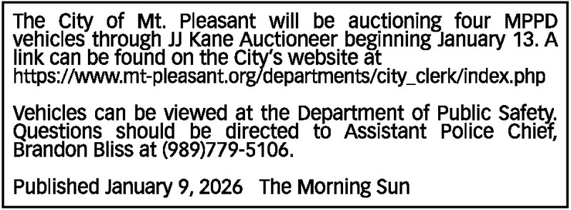 The City of Mt. Pleasant will be auctioning four MPPD vehicles through JJ Kane Auctioneer beginning January 13. A link can be found on the City’s website at https://www.mt-pleasant.org/departments/city_clerk/index.php Vehicles can be viewed at the Department of Public Safety. Questions should be directed to Assistant Police Chief, Brandon Bliss at (989)779-5106. Published January 9, 2026 The Morning Sun