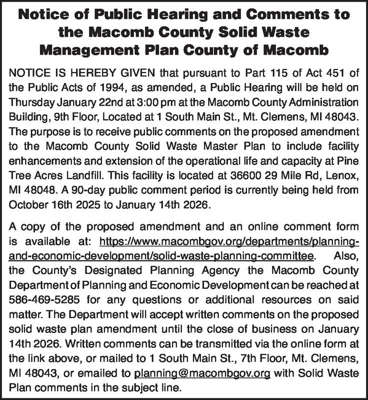Notice of Public Hearing and Comments to the Macomb County Solid Waste Management Plan County of Macomb NOTICE IS HEREBY GIVEN that pursuant to Part 115 of Act 451 of the Public Acts of 1994, as amended, a Public Hearing will be held on Thursday January 22nd at 3:00 pm at the Macomb County Administration Building, 9th Floor, Located at 1 South Main St., Mt. Clemens, MI 48043. The purpose is to receive public comments on the proposed amendment to the Macomb County Solid Waste Master Plan to include facility enhancements and extension of the operational life and capacity at Pine Tree Acres Landfill. This facility is located at 36600 29 Mile Rd, Lenox, MI 48048. A 90-day public comment period is currently being held from October 16th 2025 to January 14th 2026. A copy of the proposed amendment and an online comment form is available at: https://www.macombgov.org/departments/planning-and-economic-development/solid-waste-planning-committee . Also, the County’s Designated Planning Agency the Macomb County Department of Planning and Economic Development can be reached at 586-469-5285 for any questions or additional resources on said matter. The Department will accept written comments on the proposed solid waste plan amendment until the close of business on January 14th 2026. Written comments can be transmitted via the online form at the link above, or mailed to 1 South Main St., 7th Floor, Mt. Clemens, MI 48043, or emailed to planning@macombgov.org with Solid Waste Plan comments in the subject line.