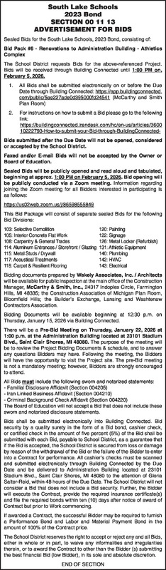 South Lake Schools 2023 Bond SECTION 00 11 13 ADVERTISEMENT FOR BIDS Sealed Bids for the South Lake Schools, 2023 Bond, consisting of: Bid Pack #6 - Renovations to Administration Building - Athletics Complex The School District requests Bids for the above-referenced Project. Bids will be received through Building Connected until 1:00 PM on, February 5, 2026. 1. All Bids shall be submitted electronically on or before the Due Date through Building Connected: https://app.buildingconnected.com/public/5ae227ade0d395000fd24541 (McCarthy and Smith Plan Room) 2. For instructions on how to submit a Bid please go to the following link: https://buildingconnected.zendesk.com/hc/en-us/articles/360010222793-How-to-submit-your- Bid-through-BuildingConnected- Bids submitted after the Due Date will not be opened, considered or accepted by the School District. Faxed and/or E-mail Bids will not be accepted by the Owner or Board of Education. Sealed Bids will be publicly opened and read aloud and tabulated, beginning at approx. 1:00 PM on February 5, 2026. Bid opening will be publicly conducted via a Zoom meeting. Information regarding joining the Zoom meeting for all Bidders interested in participating is as follows: https://us02web.zoom.us/j/86598555849 This Bid Package will consist of separate sealed Bids for the following Bid Divisions: 103: Selective Demolition 120: Painting 105: Interior Concrete Flat Work 122: Signage 108: Carpentry & General Trades 126: Metal Locker (Refurbish) 114: Aluminum Entrances / Storefront / Glazing 131: Athletic Equipment 115: Metal Studs / Drywall 140: Plumbing 117: Acoustical Treatments 142: HVAC 118: Carpet & Resilient Flooring 143: Electrical Bidding documents prepared by Wakely Associates, Inc. / Architects will be available for public inspection at the main office of the Construction Manager, McCarthy & Smith, Inc., 24317 Indoplex Circle, Farmington Hills, MI 48335; the Construction Association of Michigan Plan Room, Bloomfield Hills; the Builder’s Exchange, Lansing and Washtenaw Contractors Association. Bidding Documents will be available beginning at 12:30 p.m. on Wednesday, January 15, 2026 via Building Connected. There will be a Pre-Bid Meeting on Thursday, January 22, 2026 at 1:00 p.m. at the Administration Building located at 23101 Stadium Blvd., Saint Clair Shores, MI 48080. The purpose of the meeting will be to review the Project Bidding Documents & schedule, and to answer any questions Bidders may have. Following the meeting, the Bidders will have the opportunity to visit the Project site. The pre-Bid meeting is not a mandatory meeting; however, Bidders are strongly encouraged to attend. All Bids must include the following sworn and notarized statements: - Familial Disclosure Affidavit (Section 004205) - Iran Linked Business Affidavit (Section 004210) - Criminal Background Check Affidavit (Section 004220) The Board of Education will not accept a Bid that does not include these sworn and notarized disclosure statements. Bids shall be submitted electronically into Building Connected. Bid security by a quality surety in the form of a Bid bond, cashier check, or certified check in the amount of five percent (5%) of the Bid shall be submitted with each Bid, payable to School District, as a guarantee that if the Bid is accepted, the School District is secured from loss or damage by reason of the withdrawal of the Bid or the failure of the Bidder to enter into a Contract for performance. All cashier’s checks must be scanned and submitted electronically through Building Connected by the Due Date and be delivered to Administration Building located at 23101 Stadium Blvd., Saint Clair Shores, MI 48080 to the attention of Gloria Salter-Reid, within 48 hours of the Due Date. The School District will not consider a Bid that does not include a Bid security. Further, the Bidder will execute the Contract, provide the required insurance certificate(s) and file the required bonds within ten (10) days after notice of award of Contract but prior to Work commencing. If awarded a Contract, the successful Bidder may be required to furnish a Performance Bond and Labor and Material Payment Bond in the amount of 100% of the Contract price. The School District reserves the right to accept or reject any and all Bids, either in whole or in part, to waive any informalities and irregularities therein, or to award the Contract to other than the Bidder (s) submitting the best financial Bid (low Bidder), in its sole and absolute discretion. END OF SECTION