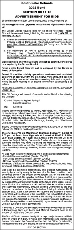 South Lake Schools 2023 Bond SECTION 00 11 13 ADVERTISEMENT FOR BIDS Sealed Bids for the South Lake Schools, 2023 Bond, consisting of: Bid Package #5 – Site Upgrades to South Lake High School – South Lot The School District requests Bids for the above-referenced Project. Bids will be received through Building Connected until (1:00) PM on, February 26, 2026. 1. All Bids shall be submitted electronically on or before the Due Date through Building Connected: https://app.buildingconnected.com/public/5ae227ade0d395000fd24541 (McCarthy and Smith Plan Room) 2. For instructions on how to submit a Bid please go to the following link: https://buildingconnected.zendesk.com/hc/en-us/articles/360010222793-How-to-submit-your- Bid-through-BuildingConnected- Bids submitted after the Due Date will not be opened, considered or accepted by the School District. Faxed and/or E-mail Bids will not be accepted by the Owner or Board of Education. Sealed Bids will be publicly opened and read aloud and tabulated, beginning at approx. (1:00) PM on, February 26, 2026. Bid opening will be publicly conducted via a Zoom meeting. Information regarding joining the Zoom meeting for all Bidders interested in participating is as follows: https://teams.microsoft.com/meet/28352536880359?p=lnzKqhFZAs 6M9FURU2 This Bid Package will consist of separate sealed Bids for the following Bid Divisions: 101/102: Sitework / Asphalt Paving / Exterior Concrete 143: Electrical Bidding documents prepared by Wakely Associates, Inc. / Architects will be available for public inspection at the main office of the Construction Manager, McCarthy & Smith, Inc., 24317 Indoplex Circle, Farmington Hills, MI 48335; the Construction Association of Michigan Plan Room, Bloomfield Hills; the Builder’s Exchange, Lansing and Washtenaw Contractors Association. Bidding Documents will be available beginning at 12:30 p.m. on Monday, February 9, 2026 via Building Connected. There will be a Pre-Bid Meeting on Thursday, February 12, 2026 @ 1:00 p.m. at South Lake High school located at 21900 E. 9 Mile, Saint Clair Shores, MI 48080. The purpose of the meeting will be to review the Project Bidding Documents & schedule, and to answer any questions Bidders may have. Following the meeting, the Bidders will have the opportunity to visit the Project site. The pre-Bid meeting is not a mandatory meeting; however, Bidders are strongly encouraged to attend. All Bids must include the following sworn and notarized statements: - Familial Disclosure Affidavit (Section 004205) - Iran Linked Business Affidavit (Section 004210) - Criminal Background Check Affidavit (Section 004220) The Board of Education will not accept a Bid that does not include these sworn and notarized disclosure statements. Bids shall be submitted electronically into Building Connected. Bid security by a quality surety in the form of a Bid bond, cashier check, or certified check in the amount of five percent (5%) of the Bid shall be submitted with each Bid, payable to School District, as a guarantee that if the Bid is accepted, the School District is secured from loss or damage by reason of the withdrawal of the Bid or the failure of the Bidder to enter into a Contract for performance. All cashier’s checks must be scanned and submitted electronically through Building Connected by the Due Date and be delivered to the Administration Building located at 23101 Stadium Blvd., Saint Clair Shores, MI 48080 to the attention of Gloria Salter-Reid, within 48 hours of the Due Date. The School District will not consider a Bid that does not include a Bid security. Further, the Bidder will execute the Contract, provide the required insurance certificate(s) and file the required bonds within ten (10) days after notice of award of Contract but prior to Work commencing. If awarded a Contract, the successful Bidder may be required to furnish a Performance Bond and Labor and Material Payment Bond in the amount of 100% of the Contract price. The School District reserves the right to accept or reject any and all Bids, either in whole or in part, to waive any informalities and irregularities therein, or to award the Contract to other than the Bidder (s) submitting the best financial Bid (low Bidder), in its sole and absolute discretion. END OF SECTION