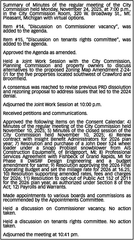 Summary of Minutes of the regular meeting of the City Commission held Monday, November 24, 2025, at 7:00 p.m., in the City Commission Room, 320 W. Broadway St., Mt. Pleasant, Michigan with virtual options. Item #14, “Discussion on Commissioner vacancy”, was added to the agenda. Item #15, “Discussion on tenants rights committee”, was added to the agenda. Approved the Agenda as amended. Held a Joint Work Session with the City Commission, Planning Commission and property owners to discuss alternatives to the proposed Zoning Map Amendment Z-24-01 for the five properties located southwest of Crawford and Broomfield. A consensus was reached to revise previous PRD dissolution and rezoning proposal to address issues that led to the 2024 denial. Adjourned the Joint Work Session at 10:00 p.m. Received petitions and communications. Approved the following items on the Consent Calendar: 4) Minutes of the regular meeting of the City Commission held November 10, 2025; 5) Minutes of the closed session of the City Commission held November 10, 2025; 6) Renew contract with Insight Benefit Administrators for 2026 plan year; 7) Resolution and purchase of a John Deer 524 wheel loader under a Snogo Problast snowblower from AIS Construction Equipment, of Bridgeport, MI; 8) Professional Services Agreement with Fishbeck of Grand Rapids, MI for Phase II DWSRF Design Engineering and a budget amendment for same; 9) Resolution approving the 2026 Final Operating Budget and set the millage rate for 2026 at 16.25; 10) Resolution supporting amended rates, fees and charges for 2026; 11) Resolution to opt-out of Public Act 152 of 2011 for the 2026 plan year, as authorized under Section 8 of the Act; 12) Payrolls and Warrants. Made appointments to various boards and commissions as recommended by the Appointments Committee. Held a discussion on Commissioner vacancy. No action taken. Held a discussion on tenants rights committee. No action taken. Adjourned the meeting at 10:41 pm.