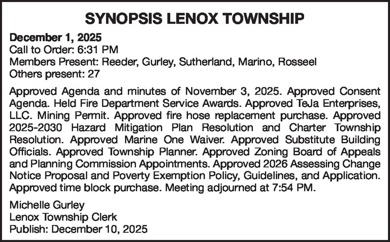 SYNOPSIS LENOX TOWNSHIP December 1, 2025 Call to Order: 6:31 PM Members Present: Reeder, Gurley, Sutherland, Marino, Rosseel Others present: 27 Approved Agenda and minutes of November 3, 2025. Approved Consent Agenda. Held Fire Department Service Awards. Approved TeJa Enterprises, LLC. Mining Permit. Approved fire hose replacement purchase. Approved 2025-2030 Hazard Mitigation Plan Resolution and Charter Township Resolution. Approved Marine One Waiver. Approved Substitute Building Officials. Approved Township Planner. Approved Zoning Board of Appeals and Planning Commission Appointments. Approved 2026 Assessing Change Notice Proposal and Poverty Exemption Policy, Guidelines, and Application. Approved time block purchase. Meeting adjourned at 7:54 PM. Michelle Gurley Lenox Township Clerk Publish: December 10, 2025