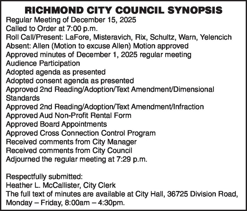 RICHMOND CITY COUNCIL SYNOPSIS Regular Meeting of December 15, 2025 Called to Order at 7:00 p.m. Roll Call/Present: LaFore, Misteravich, Rix, Schultz, Warn, Yelencich Absent: Allen (Motion to excuse Allen) Motion approved Approved minutes of December 1, 2025 regular meeting Audience Participation Adopted agenda as presented Adopted consent agenda as presented Approved 2nd Reading/Adoption/Text Amendment/Dimensional Standards Approved 2nd Reading/Adoption/Text Amendment/Infraction Approved Aud Non-Profit Rental Form Approved Board Appointments Approved Cross Connection Control Program Received comments from City Manager Received comments from City Council Adjourned the regular meeting at 7:29 p.m. Respectfully submitted: Heather L. McCallister, City Clerk The full text of minutes are available at City Hall, 36725 Division