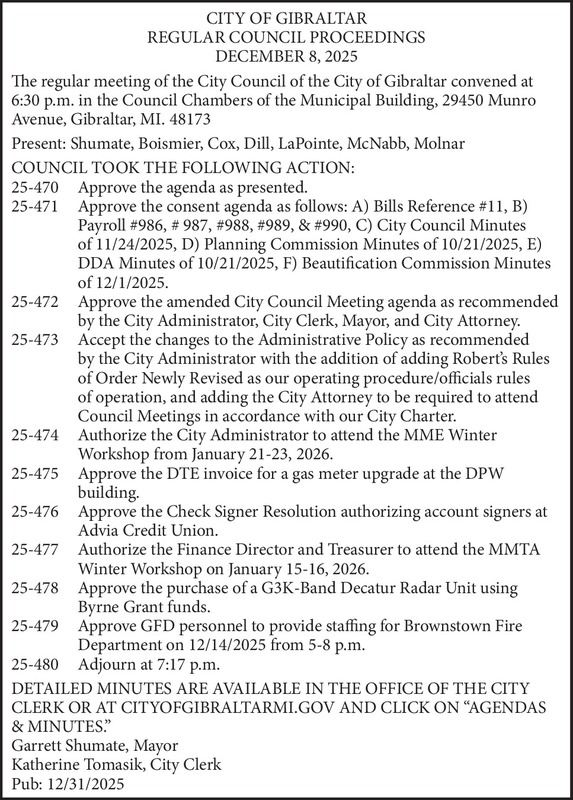 CITY OF GIBRALTAR REGULAR COUNCIL PROCEEDINGS DECEMBER 8, 2025 The regular meeting of the City Council of the City of Gibraltar convened at 6:30 p.m. in the Council Chambers of the Municipal Building, 29450 Munro Avenue, Gibraltar, MI. 48173 Present: Shumate, Boismier, Cox, Dill, LaPointe, McNabb, Molnar COUNCIL TOOK THE FOLLOWING ACTION: 25-470 Approve the agenda as presented. 25-471 Approve the consent agenda as follows: A) Bills Reference #11, B) Payroll #986, # 987, #988, #989, & #990, C) City Council Minutes of 11/24/2025, D) Planning Commission Minutes of 10/21/2025, E) DDA Minutes of 10/21/2025, F) Beautification Commission Minutes of 12/1/2025. 25-472 Approve the amended City Council Meeting agenda as recommended by the City Administrator, City Clerk, Mayor, and City Attorney. 25-473 Accept the changes to the Administrative Policy as recommended by the City Administrator with the addition of adding Robert’s Rules of Order Newly Revised as our operating procedure/officials rules of operation, and adding the City Attorney to be required to attend Council Meetings in accordance with our City Charter. 25-474 Authorize the City Administrator to attend the MME Winter Workshop from January 21-23, 2026. 25-475 Approve the DTE invoice for a gas meter upgrade at the DPW building. 25-476 Approve the Check Signer Resolution authorizing account signers at Advia Credit Union. 25-477 Authorize the Finance Director and Treasurer to attend the MMTA Winter Workshop on January 15-16, 2026. 25-478 Approve the purchase of a G3K-Band Decatur Radar Unit using Byrne Grant funds. 25-479 Approve GFD personnel to provide staffing for Brownstown Fire Department on 12/14/2025 from 5-8 p.m. 25-480 Adjourn at 7:17 p.m. DETAILED MINUTES ARE AVAILABLE IN THE OFFICE OF THE CITY CLERK OR AT CITYOFGIBRALTARMI.GOV AND CLICK ON “AGENDAS & MINUTES.” Garrett Shumate, Mayor Katherine Tomasik, City Clerk Pub: 12/31/2025