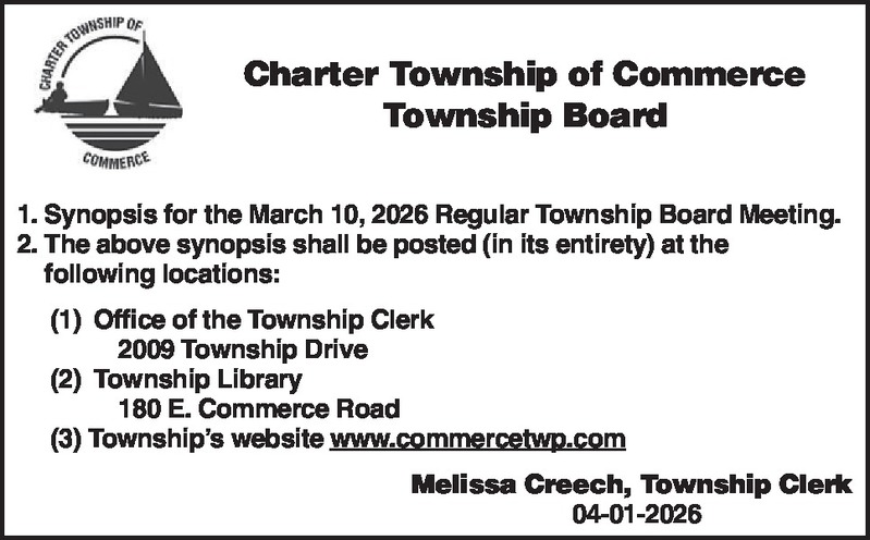 Charter Township of Commerce Township Board 1. Synopsis for the March 10, 2026 Regular Township Board Meeting. 2. The above synopsis shall be posted (in its entirety) at the following locations: (1) Office of the Township Clerk 2009 Township Drive (2) Township Library 180 E. Commerce Road (3) Township’s website www.commercetwp.com Melissa Creech, Township Clerk 04-01-2026
