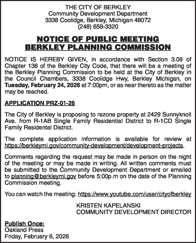 THE CITY OF BERKLEY Community Development Department 3338 Coolidge, Berkley, Michigan 48072 (248) 658-3320 NOTICE OF PUBLIC MEETING BERKLEY PLANNING COMMISSION NOTICE IS HEREBY GIVEN, in accordance with Section 3.09 of Chapter 138 of the Berkley City Code, that there will be a meeting of the Berkley Planning Commission to be held at the City of Berkley in the Council Chambers, 3338 Coolidge Hwy, Berkley Michigan, on Tuesday, February 24, 2026 at 7:00pm, or as near thereto as the matter may be reached. APPLICATION PRZ-01-26 The City of Berkley is proposing to rezone property at 2429 Sunnyknoll Ave. from R-1AB Single Family Residential District to R-1CD Single Family Residental District. The complete application information is available for review at https://berkleymi.gov/community- development/development-projects. Comments regarding the request may be made in person on the night of the meeting or may be made in writing. All written comments must be submitted to the Community Development Department or emailed to planning@berkleymi.gov before 5:00p.m on the date of the Planning Commission meeting. You can watch the meeting: https://www.youtube.com/user/cityofberkley KRISTEN KAPELANSKI COMMUNITY DEVELOPMENT DIRECTOR Publish Once: Oakland Press Friday, February 6, 2026
