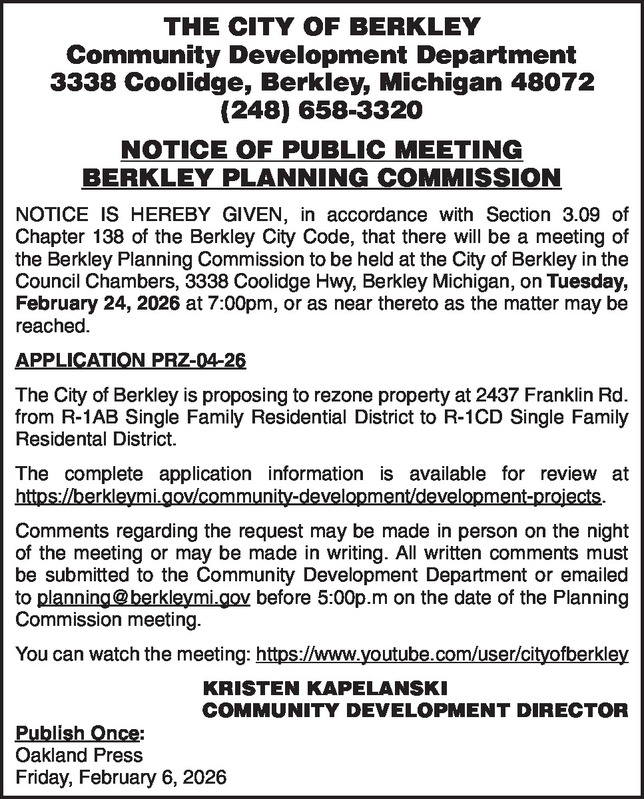 THE CITY OF BERKLEY Community Development Department 3338 Coolidge, Berkley, Michigan 48072 (248) 658-3320 NOTICE OF PUBLIC MEETING BERKLEY PLANNING COMMISSION NOTICE IS HEREBY GIVEN, in accordance with Section 3.09 of Chapter 138 of the Berkley City Code, that there will be a meeting of the Berkley Planning Commission to be held at the City of Berkley in the Council Chambers, 3338 Coolidge Hwy, Berkley Michigan, on Tuesday, February 24, 2026 at 7:00pm, or as near thereto as the matter may be reached. APPLICATION PRZ-04-26 The City of Berkley is proposing to rezone property at 2437 Franklin Rd. from R-1AB Single Family Residential District to R-1CD Single Family Residental District. The complete application information is available for review at https://berkleymi.gov/community- development/development-projects. Comments regarding the request may be made in person on the night of the meeting or may be made in writing. All written comments must be submitted to the Community Development Department or emailed to planning@berkleymi.gov before 5:00p.m on the date of the Planning Commission meeting. You can watch the meeting: https://www.youtube.com/user/cityofberkley KRISTEN KAPELANSKI COMMUNITY DEVELOPMENT DIRECTOR Publish Once: Oakland Press Friday, February 6, 2026