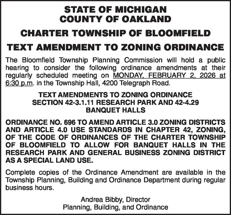 STATE OF MICHIGAN COUNTY OF OAKLAND CHARTER TOWNSHIP OF BLOOMFIELD TEXT AMENDMENT TO ZONING ORDINANCE The Bloomfield Township Planning Commission will hold a public hearing to consider the following ordinance amendments at their regularly scheduled meeting on MONDAY, FEBRUARY 2, 2026 at 6:30 p.m. in the Township Hall, 4200 Telegraph Road. TEXT AMENDMENTS TO ZONING ORDINANCE SECTION 42-3.1.11 RESEARCH PARK AND 42-4.29 BANQUET HALLS ORDINANCE NO. 696 TO AMEND ARTICLE 3.0 ZONING DISTRICTS AND ARTICLE 4.0 USE STANDARDS IN CHAPTER 42, ZONING, OF THE CODE OF ORDINANCES OF THE CHARTER TOWNSHIP OF BLOOMFIELD TO ALLOW FOR BANQUET HALLS IN THE RESEARCH PARK ZONING DISTRICT AS A SPECIAL LAND USE. Complete copies of the Ordinance Amendment are available in the Township Planning, Building and Ordinance Department during regular business hours. Andrea Bibby, Director Planning, Building, and Ordinance