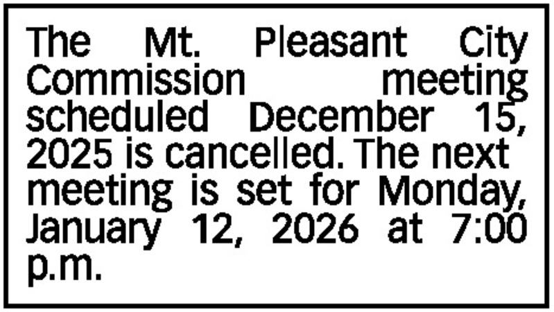 The Mt. Pleasant City Commission meeting scheduled December 15, 2025 is cancelled. The next meeting is set for Monday, January 12, 2026 at 7:00 p.m.