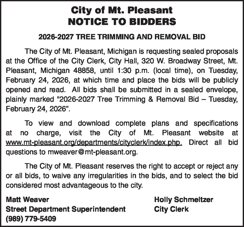 City of Mt. Pleasant NOTICE TO BIDDERS 2026-2027 TREE TRIMMING AND REMOVAL BID The City of Mt. Pleasant, Michigan is requesting sealed proposals at the Office of the City Clerk, City Hall, 320 W. Broadway Street, Mt. Pleasant, Michigan 48858, until 1:30 p.m. (local time), on Tuesday, February 24, 2026, at which time and place the bids will be publicly opened and read. All bids shall be submitted in a sealed envelope, plainly marked “2026-2027 Tree Trimming & Removal Bid – Tuesday, February 24, 2026”. To view and download complete plans and specifications at no charge, visit the City of Mt. Pleasant website at www.mt-pleasant.org/departments/city clerk/index.php. Direct all bid questions to mweaver@mt-pleasant.org. The City of Mt. Pleasant reserves the right to accept or reject any or all bids, to waive any irregularities in the bids, and to select the bid considered most advantageous to the city. Matt Weaver Holly Schmeltzer Street Department Superintendent City Clerk (989) 779-5409