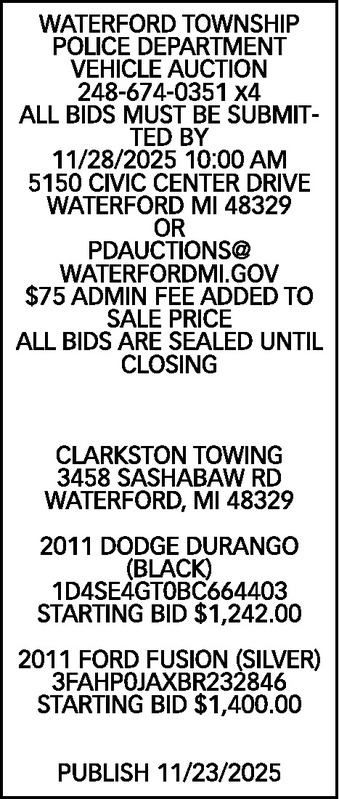 WATERFORD TOWNSHIP POLICE DEPARTMENT VEHICLE AUCTION 248-674-0351 x4 ALL BIDS MUST BE SUBMITTED BY 11/28/2025 10:00 AM 5150 CIVIC CENTER DRIVE WATERFORD MI 48329 OR PDAUCTIONS@WATERFORDMI.GOV $75 ADMIN FEE ADDED TO SALE PRICE ALL BIDS ARE SEALED UNTIL CLOSING CLARKSTON TOWING 3458 SASHABAW RD WATERFORD, MI 48329 2011 DODGE DURANGO (BLACK) 1D4SE4GT0BC664403 STARTING BID $1,242.00 2011 FORD FUSION (SILVER) 3FAHP0JAXBR232846 STARTING BID $1,400.00 PUBLISH 11/23/2025