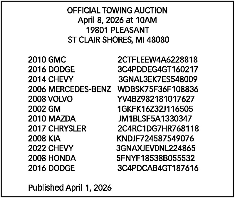 OFFICIAL TOWING AUCTION April 8, 2026 at 10AM 19801 PLEASANT ST CLAIR SHORES, MI 48080 2010 GMC 2CTFLEEW4A6228818 2016 DODGE 3C4PDDEG4GT160217 2014 CHEVY 3GNAL3EK7ES548009 2006 MERCEDES-BENZ WDBSK75F36F108836 2008 VOLVO YV4BZ982181017627 2002 GM 1GKFK16Z32J116505 2010 MAZDA JM1BLSF5A1330347 2017 CHRYSLER 2C4RC1DG7HR768118 2008 KIA KNDJF724587549076 2022 CHEVY 3GNAXJEV0NL224865 2008 HONDA 5FNYF18538B055532 2016 DODGE 3C4PDCAB4GT187616 Published April 1, 2026