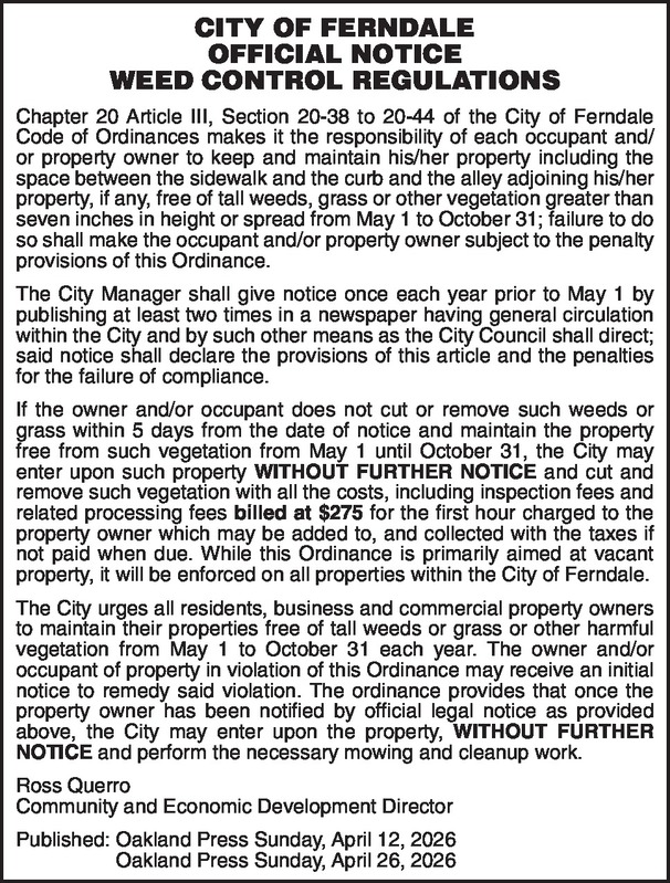 CITY OF FERNDALE OFFICIAL NOTICE WEED CONTROL REGULATIONS Chapter 20 Article III, Section 20-38 to 20-44 of the City of Ferndale Code of Ordinances makes it the responsibility of each occupant and/or property owner to keep and maintain his/her property including the space between the sidewalk and the curb and the alley adjoining his/her property, if any, free of tall weeds, grass or other vegetation greater than seven inches in height or spread from May 1 to October 31; failure to do so shall make the occupant and/or property owner subject to the penalty provisions of this Ordinance. The City Manager shall give notice once each year prior to May 1 by publishing at least two times in a newspaper having general circulation within the City and by such other means as the City Council shall direct; said notice shall declare the provisions of this article and the penalties for the failure of compliance. If the owner and/or occupant does not cut or remove such weeds or grass within 5 days from the date of notice and maintain the property free from such vegetation from May 1 until October 31, the City may enter upon such property WITHOUT FURTHER NOTICE and cut and remove such vegetation with all the costs, including inspection fees and related processing fees billed at $275 for the first hour charged to the property owner which may be added to, and collected with the taxes if not paid when due. While this Ordinance is primarily aimed at vacant property, it will be enforced on all properties within the City of Ferndale. The City urges all residents, business and commercial property owners to maintain their properties free of tall weeds or grass or other harmful vegetation from May 1 to October 31 each year. The owner and/or occupant of property in violation of this Ordinance may receive an initial notice to remedy said violation. The ordinance provides that once the property owner has been notified by official legal notice as provided above, the City may enter upon the property, WITHOUT FURTHER NOTICE and perform the necessary mowing and cleanup work. Ross Querro Community and Economic Development Director Published: Oakland Press Sunday, April 12, 2026 Oakland Press Sunday, April 26, 2026