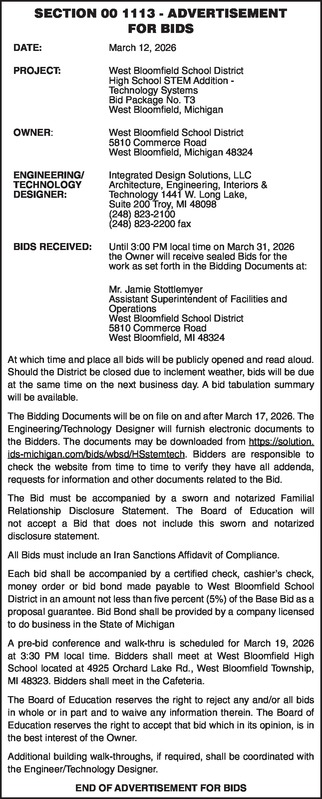 West Bloomfield School District High School STEM Addition – Technology Systems Bid Package No. T3 West Bloomfield, Michigan IDS Project No. 23235-1000 BP-T3 ADVERTISEMENT FOR BIDS 00 1113-1 SECTION 00 1113 - ADVERTISEMENT FOR BIDS DATE: March 12, 2026 PROJECT: West Bloomfield School District High School STEM Addition - Technology Systems Bid Package No. T3 West Bloomfield, Michigan OWNER: West Bloomfield School District 5810 Commerce Road West Bloomfield, Michigan 48324 ENGINEERING/ TECHNOLOGY DESIGNER: Integrated Design Solutions, LLC Architecture, Engineering, Interiors & Technology 1441 W. Long Lake, Suite 200 Troy, MI 48098 (248) 823-2100 (248) 823-2200 fax BIDS RECEIVED: Until 3:00 PM local time on March 31, 2026 the Owner will receive sealed Bids for the work as set forth in the Bidding Documents at: Mr. Jamie Stottlemyer Assistant Superintendent of Facilities and Operations West Bloomfield School District 5810 Commerce Road West Bloomfield, MI 48324 At which time and place all bids will be publicly opened and read aloud. Should the District be closed due to inclement weather, bids will be due at the same time on the next business day. A bid tabulation summary will be available. The Bidding Documents will be on file on and after March 17, 2026. The Engineering/Technology Designer will furnish electronic documents to the Bidders. The documents may be downloaded from https://solution.ids-michigan.com/bids/wbsd/HSstemtech. Bidders are responsible to check the website from time to time to verify they have all addenda, requests for information and other documents related to the Bid. The Bid must be accompanied by a sworn and notarized Familial Relationship Disclosure Statement. The Board of Education will not accept a Bid that does not include this sworn and notarized disclosure statement. All Bids must include an Iran Sanctions Affidavit of Compliance. Each bid shall be accompanied by a certified check, cashier’s check, money order or bid bond made payable to West Bloomfield School District in an amount not less than five percent (5%) of the Base Bid as a proposal guarantee. Bid Bond shall be provided by a company licensed to do business in the State of Michigan A pre-bid conference and walk-thru is scheduled for March 19, 2026 at 3:30 PM local time. Bidders shall meet at West Bloomfield High School located at 4925 Orchard Lake Rd., West Bloomfield Township, MI 48323. Bidders shall meet in the Cafeteria. The Board of Education reserves the right to reject any and/or all bids in whole or in part and to waive any information therein. The Board of Education reserves the right to accept that bid which in its opinion, is in the best interest of the Owner. Additional building walk-throughs, if required, shall be coordinated with the Engineer/Technology Designer. END OF ADVERTISEMENT FOR BIDS