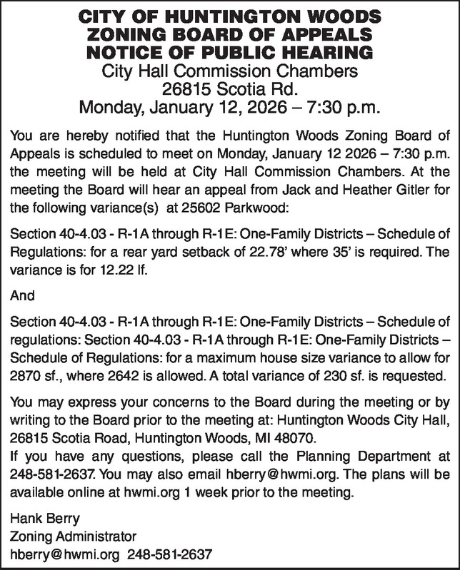 CITY OF HUNTINGTON WOODS ZONING BOARD OF APPEALS NOTICE OF PUBLIC HEARING City Hall Commission Chambers 26815 Scotia Rd. Monday, January 12, 2026 – 7:30 p.m. You are hereby notified that the Huntington Woods Zoning Board of Appeals is scheduled to meet on Monday, January 12 2026 – 7:30 p.m. the meeting will be held at City Hall Commission Chambers. At the meeting the Board will hear an appeal from Jack and Heather Gitler for the following variance(s) at 25602 Parkwood: Section 40-4.03 - R-1A through R-1E: One-Family Districts – Schedule of Regulations: for a rear yard setback of 22.78’ where 35’ is required. The variance is for 12.22 lf. And Section 40-4.03 - R-1A through R-1E: One-Family Districts – Schedule of regulations: Section 40-4.03 - R-1A through R-1E: One-Family Districts – Schedule of Regulations: for a maximum house size variance to allow for 2870 sf., where 2642 is allowed. A total variance of 230 sf. is requested. You may express your concerns to the Board during the meeting or by writing to the Board prior to the meeting at: Huntington Woods City Hall, 26815 Scotia Road, Huntington Woods, MI 48070. If you have any questions, please call the Planning Department at 248-581-2637. You may also email hberry@hwmi.org. The plans will be available online at hwmi.org 1 week prior to the meeting. Hank Berry Zoning Administrator hberry@hwmi.org 248-581-2637