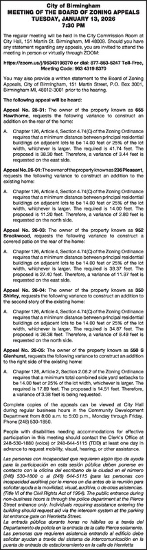City of Birmingham MEETING OF THE BOARD OF ZONING APPEALS TUESDAY, JANUARY 13, 2026 7:30 PM The regular meeting will be held in the City Commission Room at City Hall, 151 Martin St. Birmingham, MI 48009. Should you have any statement regarding any appeals, you are invited to attend the meeting in person or virtually through ZOOM: https://zoom.us/j/96343198370 or dial: 877-853-5247 Toll-Free, Meeting Code: 963 4319 8370 You may also provide a written statement to the Board of Zoning Appeals, City of Birmingham, 151 Martin Street, P.O. Box 3001, Birmingham MI, 48012-3001 prior to the hearing. The following appeal will be heard: Appeal No. 25-31: The owner of the property known as 655 Hawthorne, requests the following variance to construct an addition on the rear of the home: A. Chapter 126, Article 4, Section 4.74(C) of the Zoning Ordinance requires that a minimum distance between principal residential buildings on adjacent lots to be 14.00 feet or 25% of the lot width, whichever is larger. The required is 41.74 feet. The proposed is 38.30 feet. Therefore, a variance of 3.44 feet is requested on the east side. Appeal No. 26-01: The owner of the property known as 236 Pleasant, requests the following variance to construct an addition to the existing home: A. Chapter 126, Article 4, Section 4.74(C) of the Zoning Ordinance requires that a minimum distance between principal residential buildings on adjacent lots to be 14.00 feet or 25% of the lot width, whichever is larger. The required is 14.00 feet. The proposed is 11.20 feet. Therefore, a variance of 2.80 feet is requested on the north side. Appeal No. 26-03: The owner of the property known as 952 Brookwood, requests the following variance to construct a covered patio on the rear of the home: A. Chapter 126, Article 4, Section 4.74(C) of the Zoning Ordinance requires that a minimum distance between principal residential buildings on adjacent lots to be 14.00 feet or 25% of the lot width, whichever is larger. The required is 39.37 feet. The proposed is 27.40 feet. Therefore, a variance of 11.97 feet is requested on the east side. Appeal No. 26-04: The owner of the property known as 350 Shirley, requests the following variance to construct an addition to the second story of the existing home: A. Chapter 126, Article 4, Section 4.74(C) of the Zoning Ordinance requires that a minimum distance between principal residential buildings on adjacent lots to be 14.00 feet or 25% of the lot width, whichever is larger. The required is 34.87 feet. The proposed is 26.38 feet. Therefore, a variance of 8.49 feet is requested on the north side. Appeal No. 26-05: The owner of the property known as 550 S Glenhurst , requests the following variance to construct an addition to the right side of the existing home: A. Chapter 126, Article 2, Section 2.06.2 of the Zoning Ordinance requires that a minimum total combined side yard setbacks to be 14.00 feet or 25% of the lot width, whichever is larger. The required is 17.89 feet. The proposed is 14.51 feet. Therefore, a variance of 3.38 feet is being requested. Complete copies of the appeals can be viewed at City Hall during regular business hours in the Community Development Department from 8:00 a.m. to 5:00 p.m., Monday through Friday. Phone (248) 530-1850. People with disabilities needing accommodations for effective participation in this meeting should contact the Clerk’s Office at 248-530-1880 (voice) or 248-644-5115 (TDD) at least one day in advance to request mobility, visual, hearing, or other assistance. Las personas con incapacidad que requieren algún tipo de ayuda para la participación en esta sesión pública deben ponerse en contacto con la oficina del escribano de la ciudad en el número (248) 530-1800 o al (248) 644-5115 (para las personas con incapacidad auditiva) por lo menos un dia antes de la reunión para solicitar ayuda a la movilidad, visual, auditiva, o de otras asistencias. (Title VI of the Civil Rights Act of 1964). The public entrance during non-business hours is through the police department at the Pierce Street entrance only. Individuals requiring assistance entering the building should request aid via the intercom system at the parking lot entrance gate on Henrietta Street. La entrada pública durante horas no hábiles es a través del Departamento de policía en la entrada de la calle Pierce solamente. Las personas que requieren asistencia entrando al edificio debe solicitar ayudan a través del sistema de intercomunicación en la puerta de entrada de estacionamiento en la calle de Henrietta